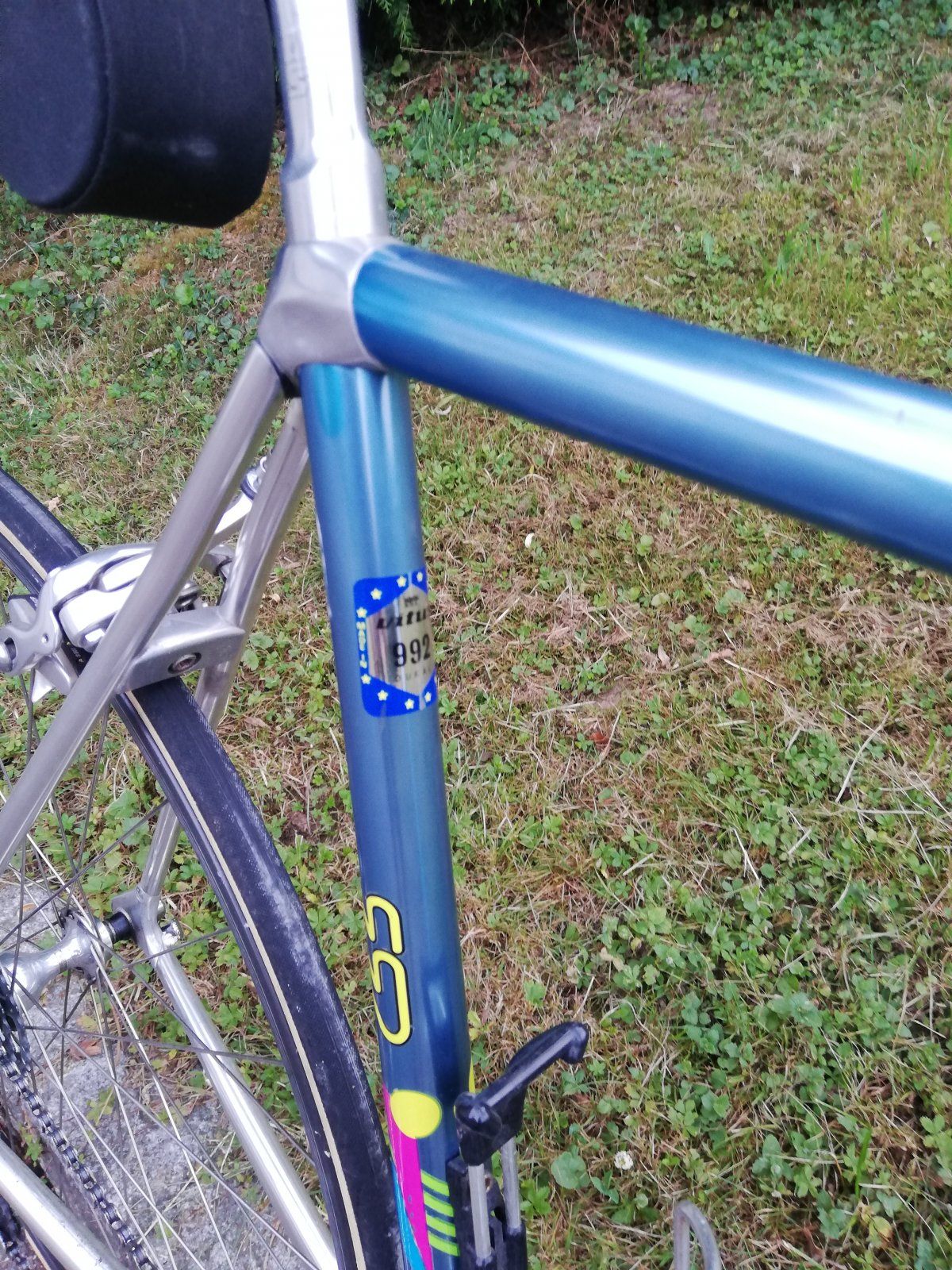 Bis auf ein paar abgefallene Decals ist der Rahmen makellos. Tretlager Steuersatz und Naben auch 1A. Campa Omega Drahtreifen Felgen gerade mal angebremst, hinten bissl mehr als vorne.