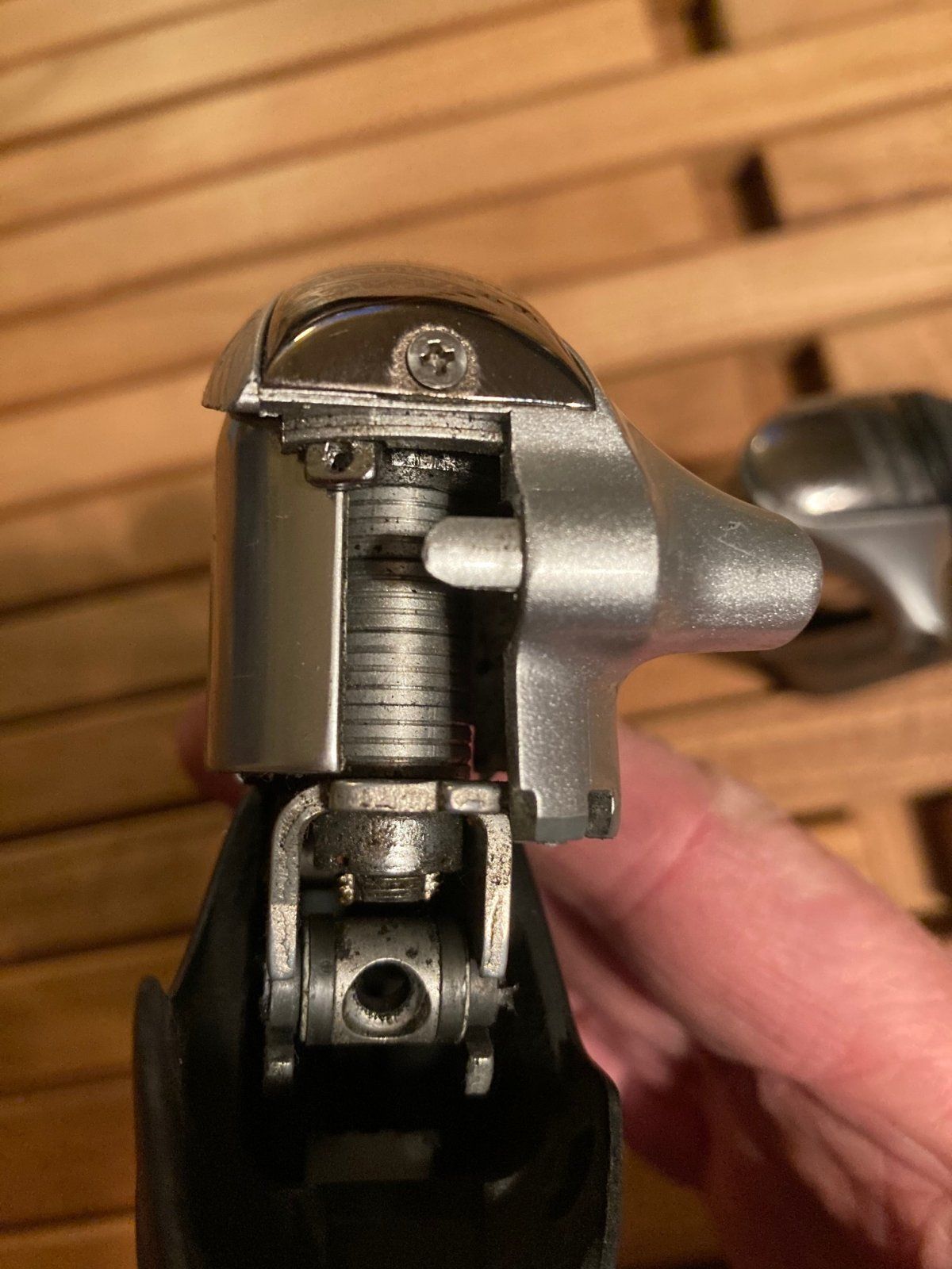 • Linker Hebel hat nur noch Bremsfunktion. Der Schalthebel und die Schaltmechanik wurden entfernt und durch einen Stapel Unterlegscheiben ersetzt. Warum (ob defekt oder links oldschool mit Rahmenschalthebel gefahren wurde) kann ich nicht mehr feststellen. Er hakt auch etwas kurz vor der Ruheposition, ob sich das nach Montage eines Bremszuges löst habe ich nicht herausgefunden, sehe aber nicht warum das zu beheben sein sollte.
