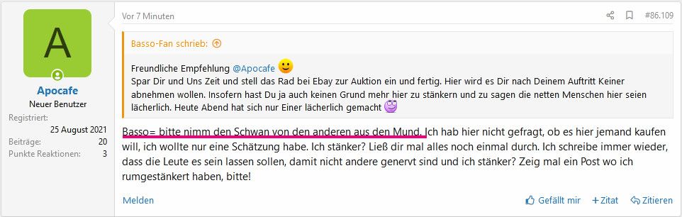Basso= bitte nimm den Schwan von den anderen aus den Mund. Ich hab hier nicht gefragt, ob es hier jemand kaufen will, ich wollte nur eine Schätzung habe. Ich stänker? Ließ dir mal alles noch einmal durch. Ich schreibe immer wieder, dass die Leute es sein lassen sollen, damit nicht andere genervt sind und ich stänker? Zeig mal ein Post wo ich rumgestänkert haben, bitte!