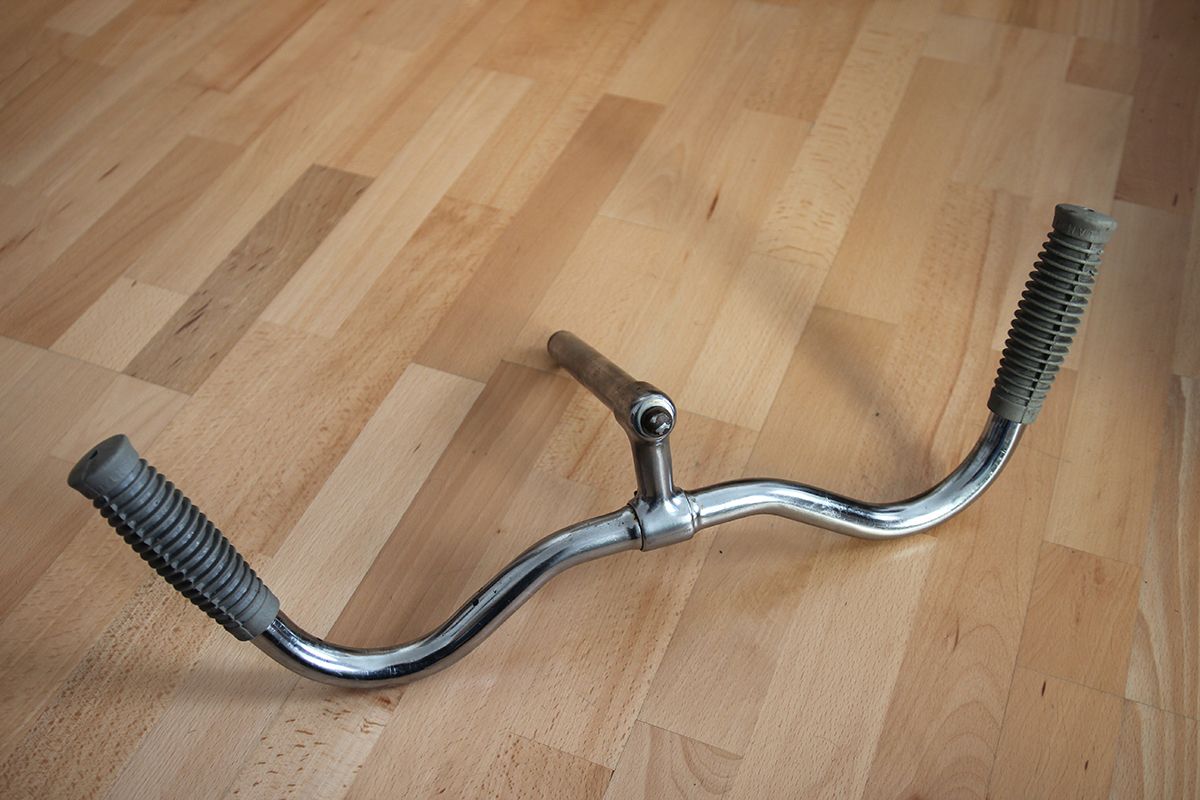 Dann habe ich hier noch eine Stahl-Lenker-Vorbau-Kombi mit einem schönen franz. Trainingsbügel von einem ollen Bauer aus den 1950ern/1960ern. Interessant sind vielleicht die Griffgummis, die ich direkt mal mit Fett behandelt habe. Sie wirken insgesamt noch weich. Beschriftet mit "LAMELLEN CONTINENTAL". Kann ich leider nicht zuordnen. Wird das womöglich gesucht?