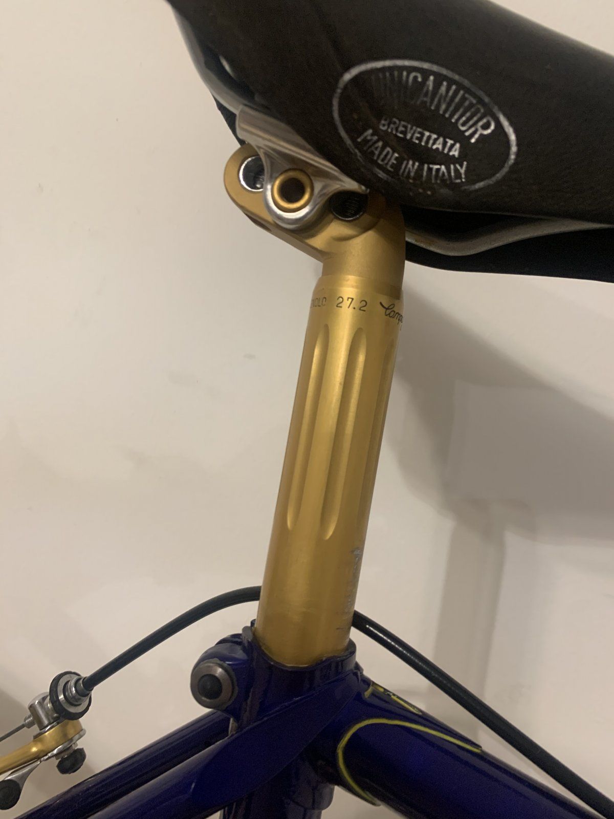 Ich habe hier eine Campa Sattelstütze mit Kessels Gravur und entsprechend ausgelegten Flutungen. Ich bin mir nicht sicher, ob die Gestellaufnahmen original sind, da sie relativ locker auf den Zapfen sitzen. Das würde ich von Campa eigentlich nicht erwarten. Funktionieren tun sie natürlich, die Stütze ist neu.