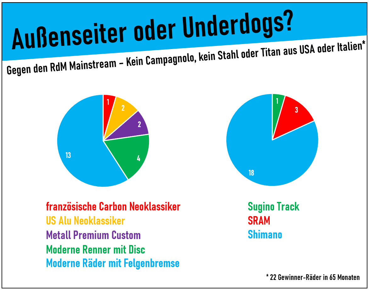 In meinem eigenen Soziotop sind rund 80 Leute, mit denen ich mehr oder weniger regelmäßig fahre. Viele Strava Bekanntschaften. Ziehe ich die Klassiker-Liebhaber ab, bleiben vielleicht 60 oder 70 mit modernen Rädern. Da bin ich neben