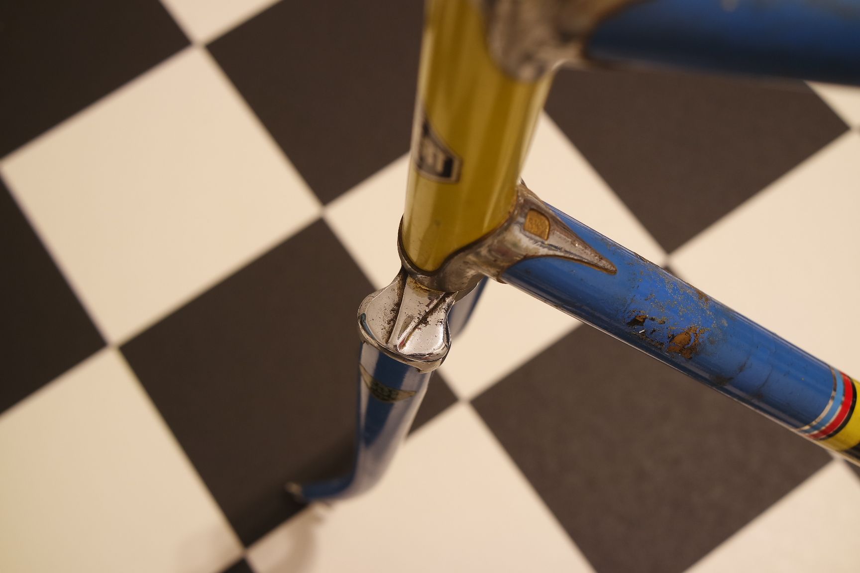 ( "D" an der Muffe zwischen Steuerrohr und Unterrohr, ( Signatur ? Zulieferer von Muffen ??? ( wohl kaum, aber wer weiss), Loch in der Mitte der vorderen Verbindung der Kettenstreben, Löcher unten am Oberrohr ( original oder "Tuningversuch" in den 90ern ???