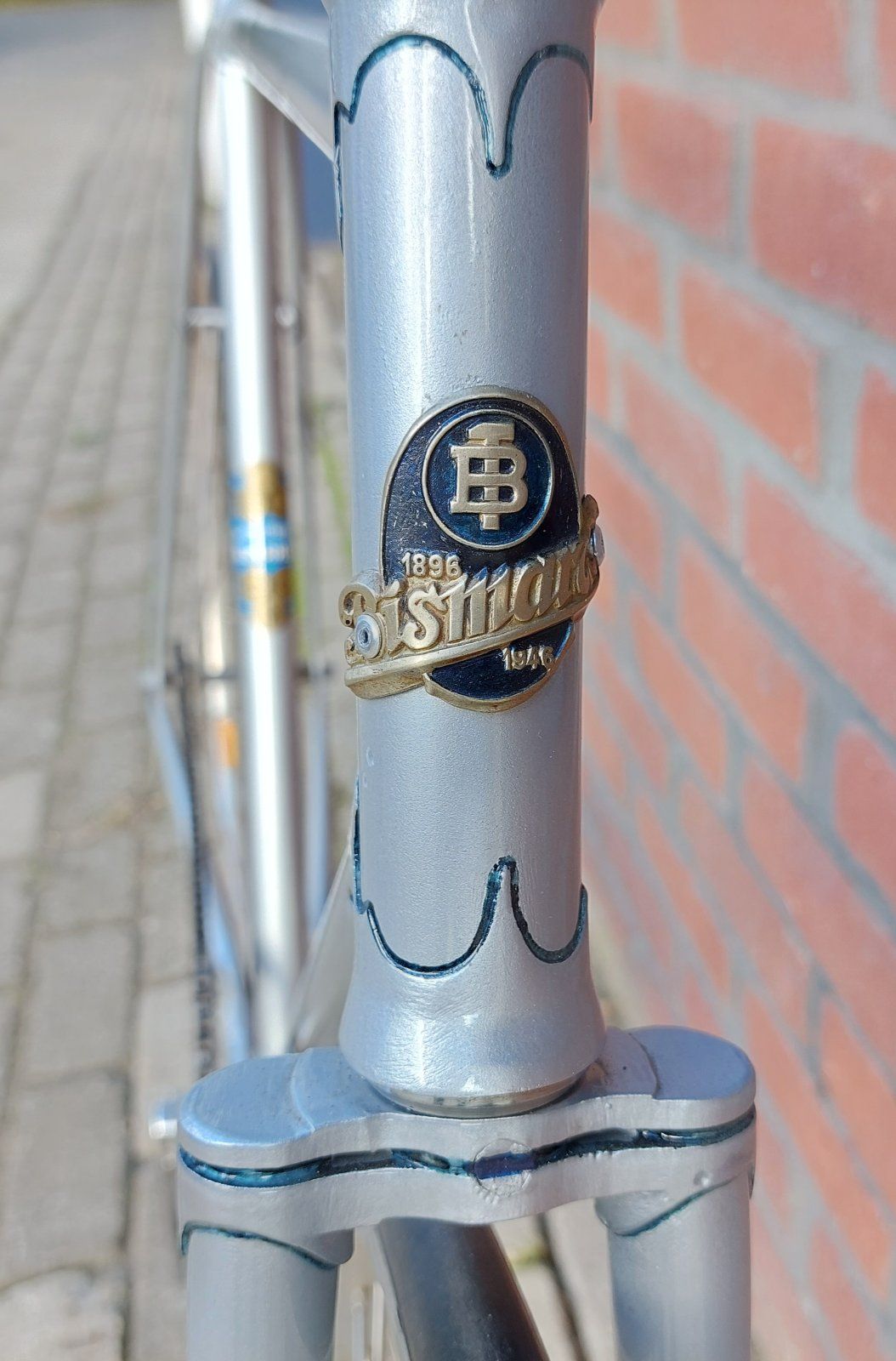 Aufgrund der konstruktiven Merkmale (Steuerrohr, Blockkette) würde ich den Rahmen eher in den frühen 50ern sehen.Moin, ein Bismarck Bahnrad.