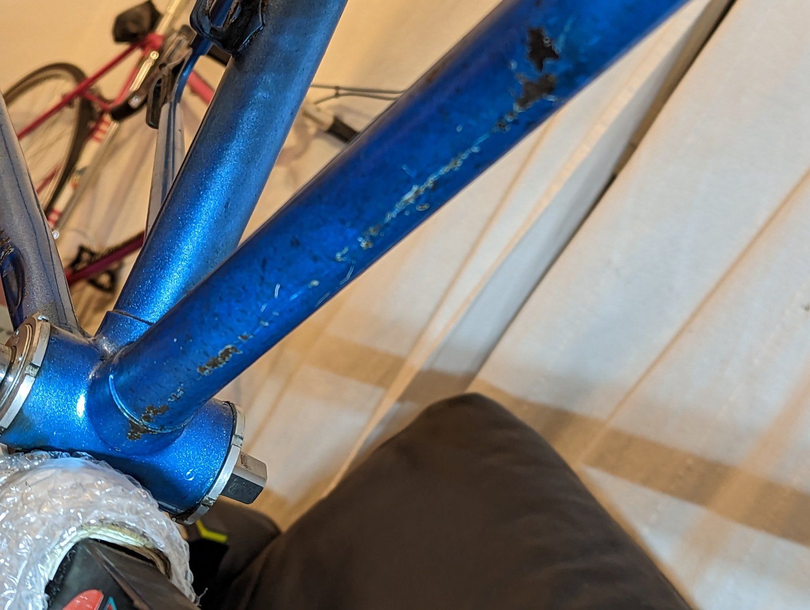 Krautscheid Rahmen Anfang 80er in Blau-Metallic, schön gemacht. Technisch konnte ich keine Probleme feststellen - Leider ist an einigen Stellen (hauptsächlich von unten?!) der Lack schon sehr schlecht, genauso wie einige Decals.