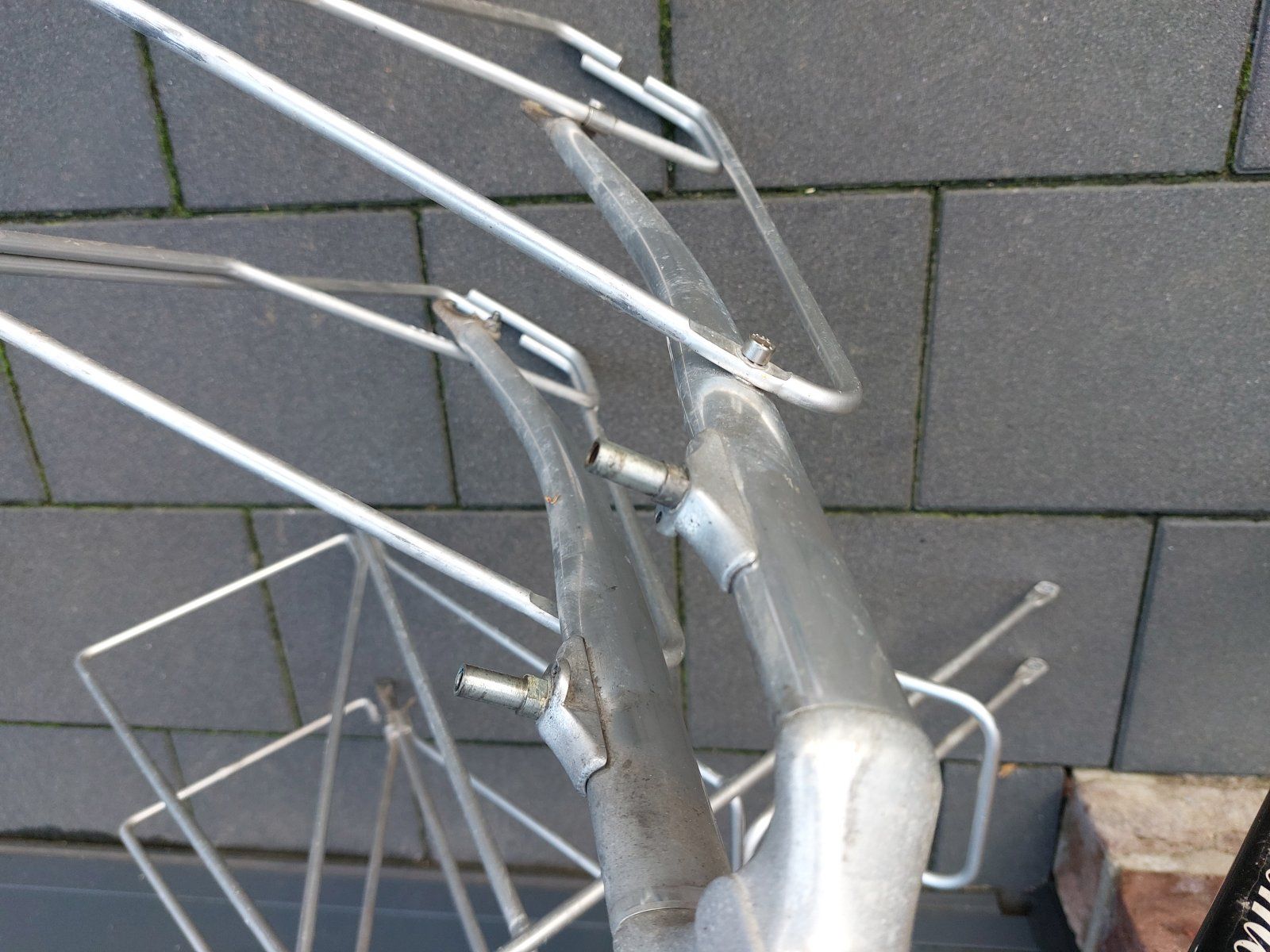 die träger sind interessant, zumindest der hintere sollte als option mit dem rahmen verkauft werden (andernfalls deutlich geld einbringen), da er am sitzrohr seine anlöter hat - außergewöhnlich!