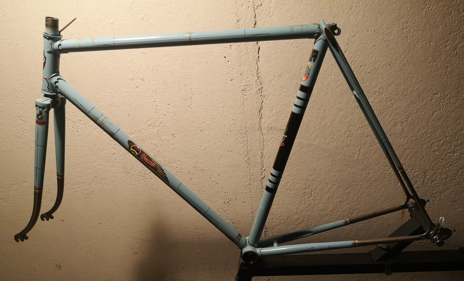 Komplett aus Reynolds 531, schönen Nervex Muffen und mit veritabler Delle im Unterrohr. Der Rahmen ist wirklich ordentlich gebraucht und der Vorbesitzer hat partiell auch etwas nachgepinselt. Trotzdem immer noch sehr hübsch mit tollen Linierungen. Dem Aufkleber am Steuerrohr nach aus französischer Produktion. Also wahrscheinlich ein Mercier.