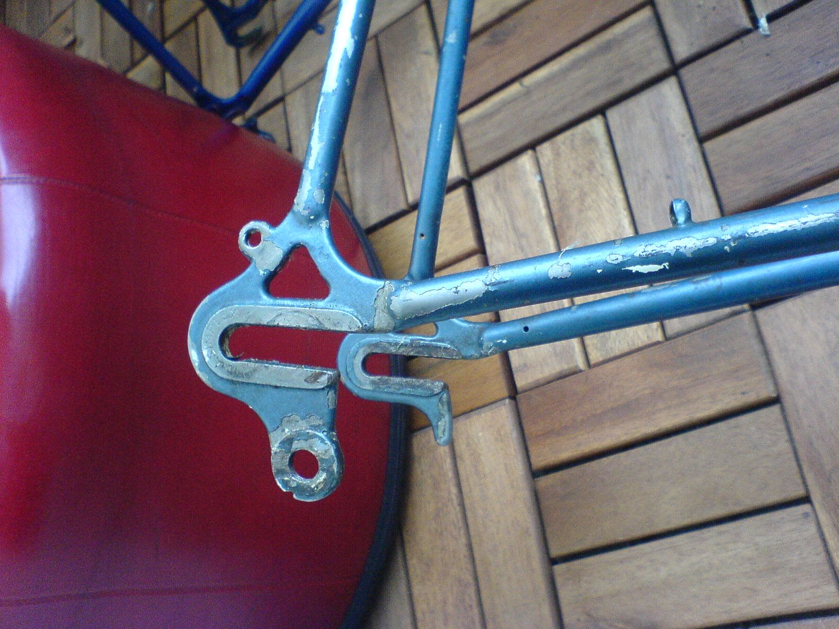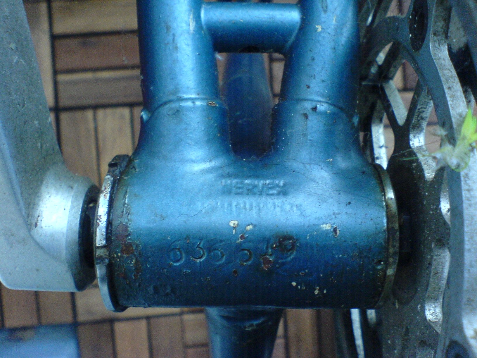 definitv älter und vielleicht französisch. Leider ohne Gabel. Nervex Muffen, Ausfallenden Simplex. Verbaut ist eine Stronglight-Kurbel, auf der Tretlagerschale steht 35x1 (also zumindes Franz. Tretlager).Bremszugbefestigung mittels Schellen. Der Lackzustand ist leider sehr schlecht, es waren eine Reihe von Aufkleber verklebt, von denen jedoch kein er mehr erhalten ist. Lagerschalen im Rahmen sind Campagnolo <C> Record