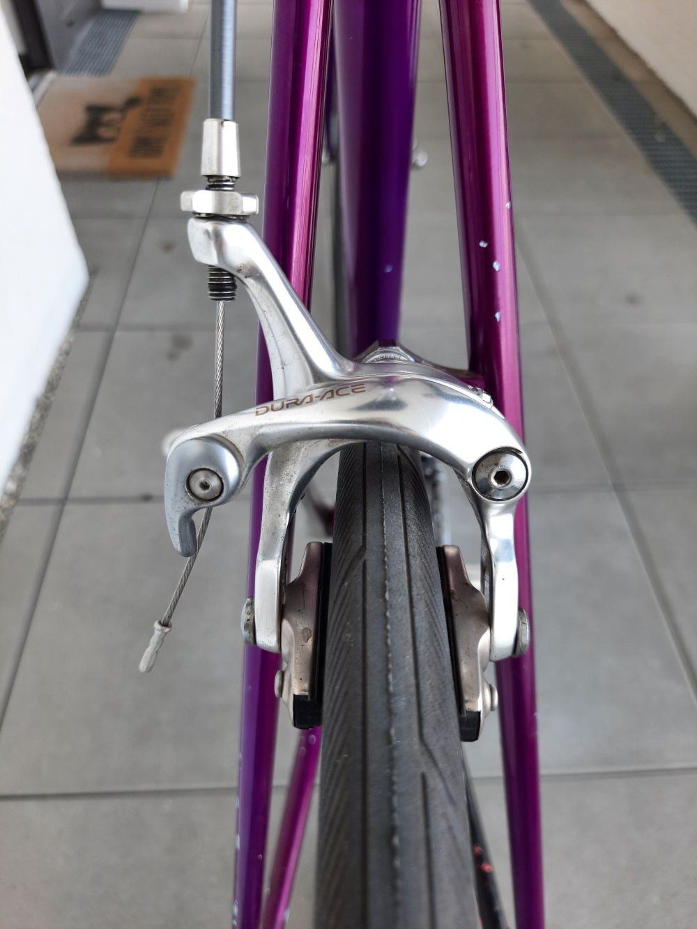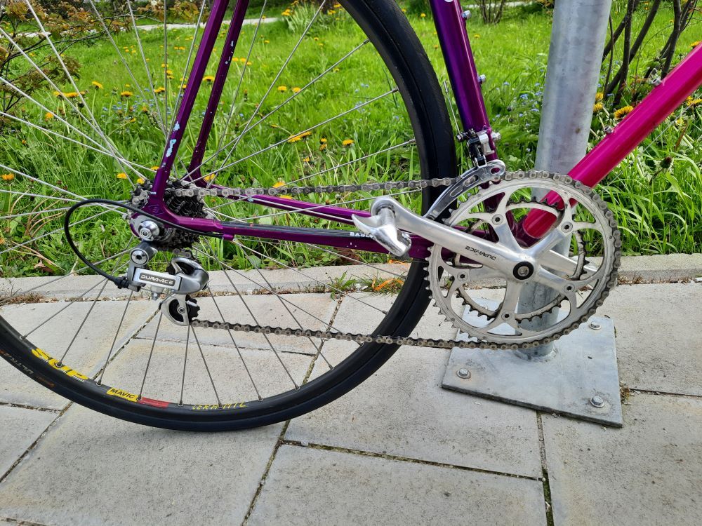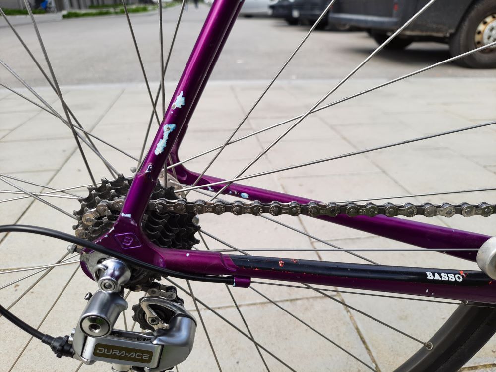 Es wäre ein 57cm großes BASSO "Fior di Loto" Vintage Rennrad. Der Rahmen ist von Anfang 90 und hat damals an die 1000 DM gekostet. Rahmennummer 9410105/57. Er wurde speziell für Ihn angefertigt, Körpergröße 1.80 bis 1.84cm. Bremsen, Kettenblatt mit Kurbel, Schaltung und Bremshebel mit Schaltfunktion alles Dura Ace. Felgen von Mavic. Rahmen mit Gebrauchsspuren, siehe Fotos.