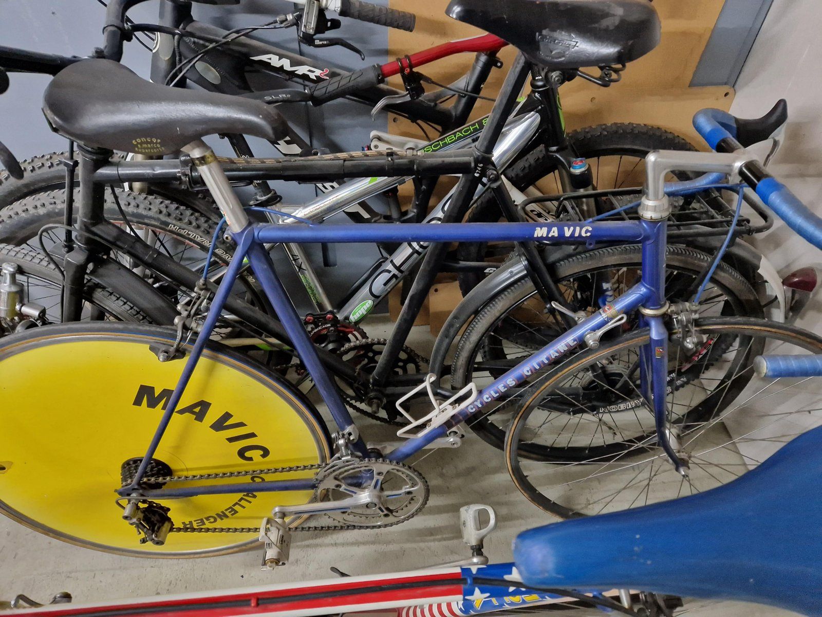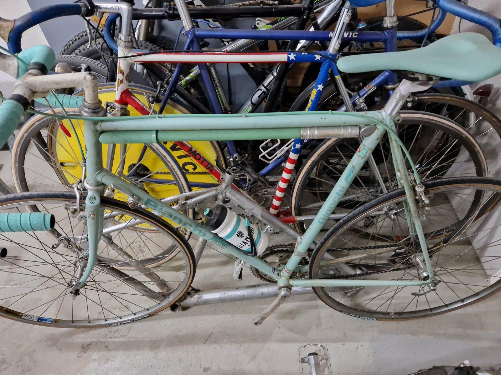 Das Bianchi ist ein 86er oder 87er Rekord 920. Zustand; siehst du ja, die Decals blättern, der Hinterbau sieht schlecht aus und wie man die Farbe am Vorbau so abgeblättert hinbekommt, ist mir schleierhaft. Das würde ich mir anschauen wollen. Dazu kann man kaum die Teile beurteilen, man sieht nicht mal, ob sie überhaupt original sind.