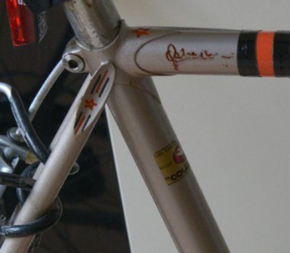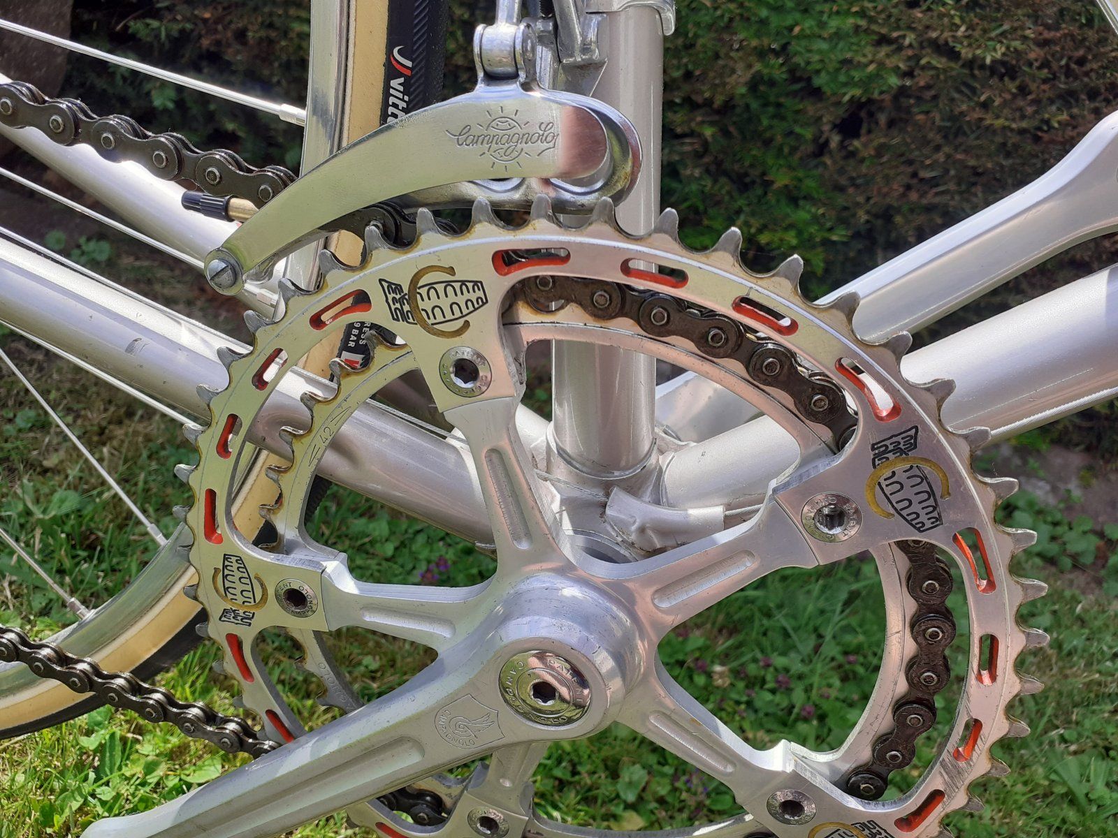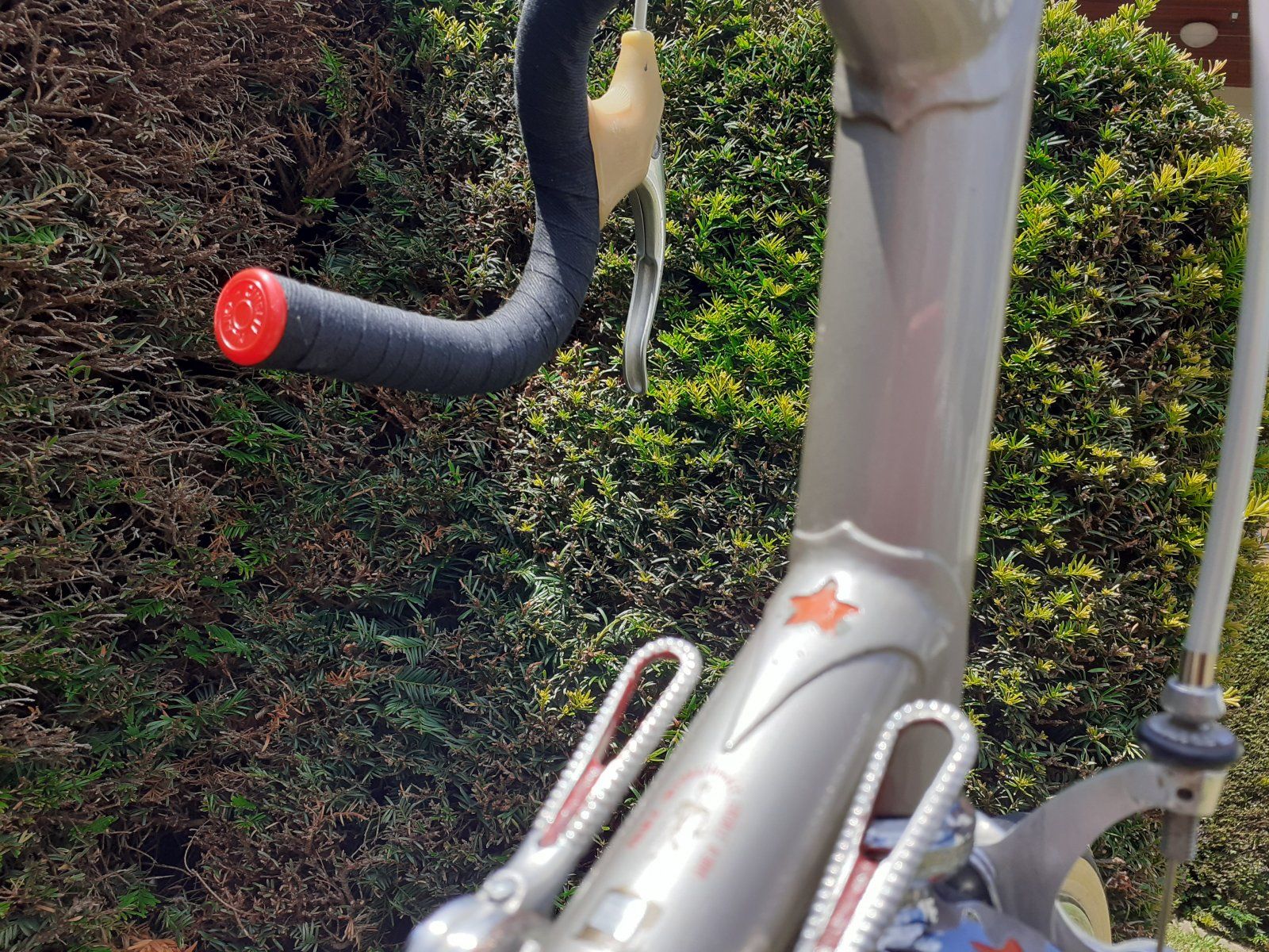 Aktuell ist das Rad mit den Gipiemme Techno Systemlaufrädern aufgebaut. Dazu habe ich noch den originalen Dura Ace 7400 LRS mit Campa Omega V Felgen. Den würde ich ebenfalls veräußern. Das Rad ist in einem guten Zustand finde ich, leider hat es auf der rechten Seite Abschürfungen an der Sattelstrebe und auf der linken Seite eine kleine Beule, vermutlich auf Grund eines Schuhs. Der Lenker, der aktuell montiert ist, war NOS, als ich ihn verbaut habe, weil der letzte Alu-Fraß hatte. Die Hoods der Bremshebel sind nicht wahnsinnig klebrig, ich finde es nicht unangenehm, damit zu fahren. Der Flaschenhalter war ein Geschenk vom @gridno27, der bleibt hier.