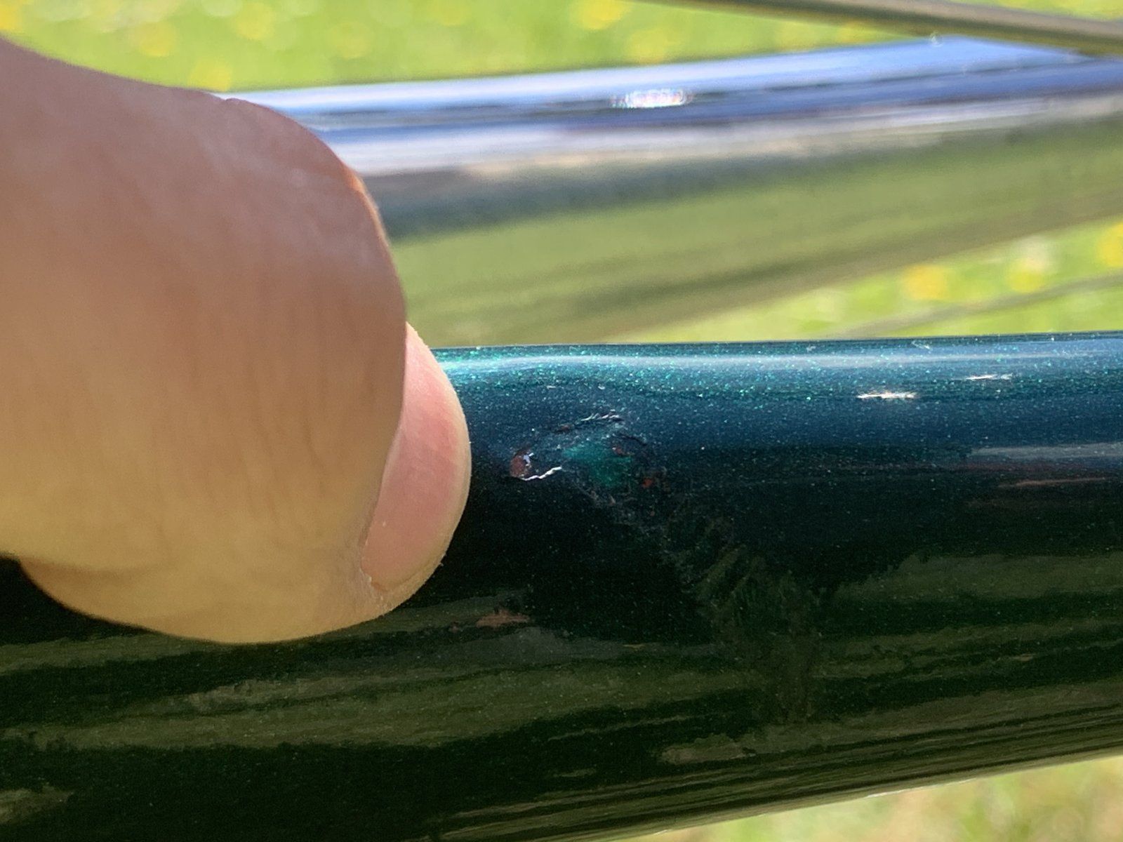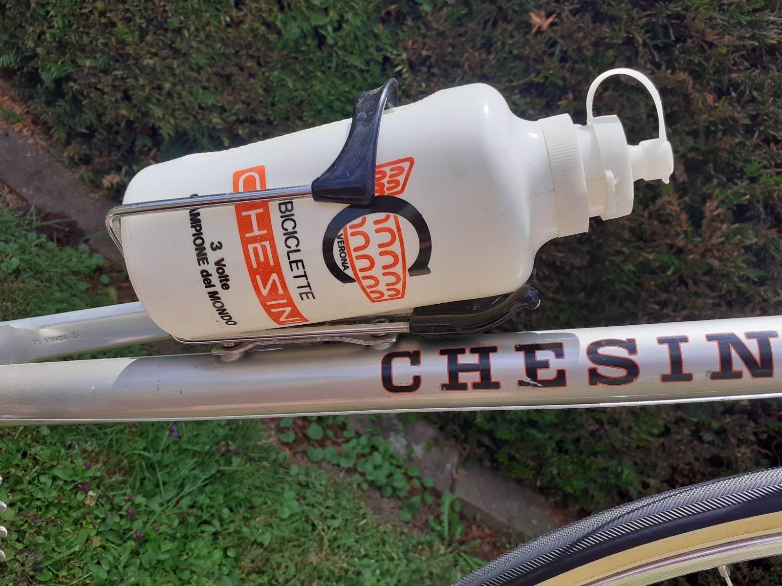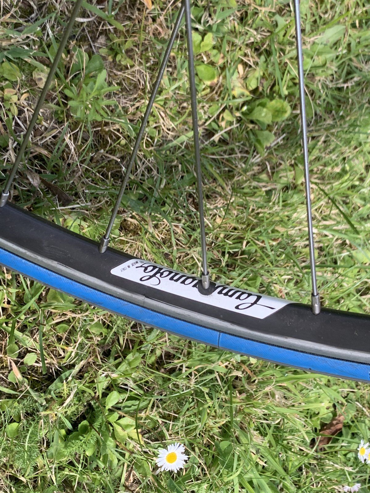 Aktuell ist das Rad mit den Gipiemme Techno Systemlaufrädern aufgebaut. Dazu habe ich noch den originalen Dura Ace 7400 LRS mit Campa Omega V Felgen. Den würde ich ebenfalls veräußern. Das Rad ist in einem guten Zustand finde ich, leider hat es auf der rechten Seite Abschürfungen an der Sattelstrebe und auf der linken Seite eine kleine Beule, vermutlich auf Grund eines Schuhs. Der Lenker, der aktuell montiert ist, war NOS, als ich ihn verbaut habe, weil der letzte Alu-Fraß hatte. Die Hoods der Bremshebel sind nicht wahnsinnig klebrig, ich finde es nicht unangenehm, damit zu fahren. Der Flaschenhalter war ein Geschenk vom @gridno27, der bleibt hier.