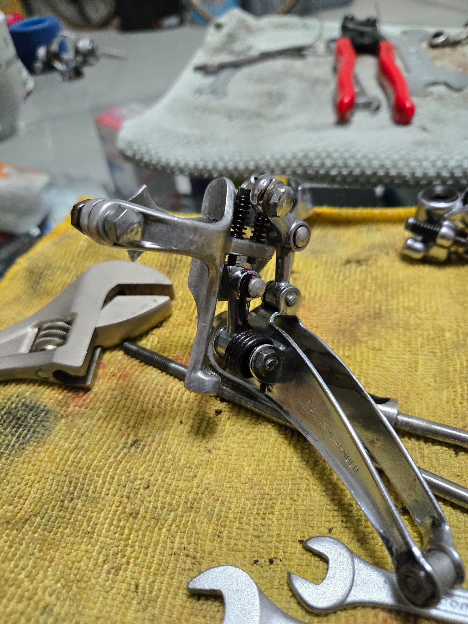 Es handelt sich hierbei um den Strada Umwerfer 1052/1 aus der ersten Generation (zugehöriges Schaltwerk ist das Gran Sport 1012/4 aus Bronze).Bin grad dabei paar Sachen zu putzen, diesen Umwerfer von Campa, davon mal gehört, nie in echt gesehen..