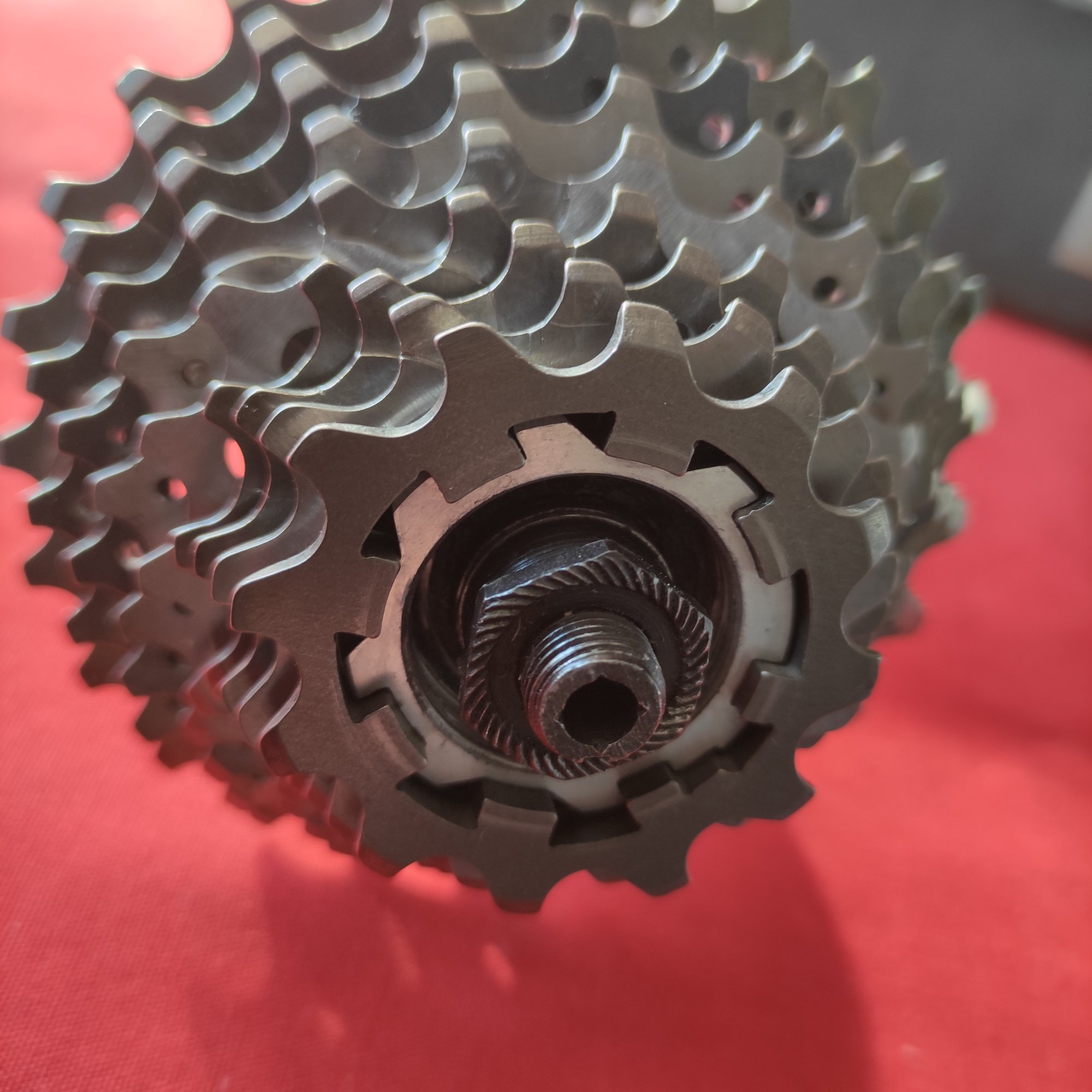 So sieht das Chorus Nabenpaar aus, erkennbar anhand des Schnellspanners. Die Record Titanium Naben aus dieser Generation waren bis auf die Schnellspanner, Sperrklinken (Titan) und Freilaufunterteil (Titan) identisch mit Chorus. Freiläufe ab 9-fach sind m.E. bis einschl 12-fach geeignet.