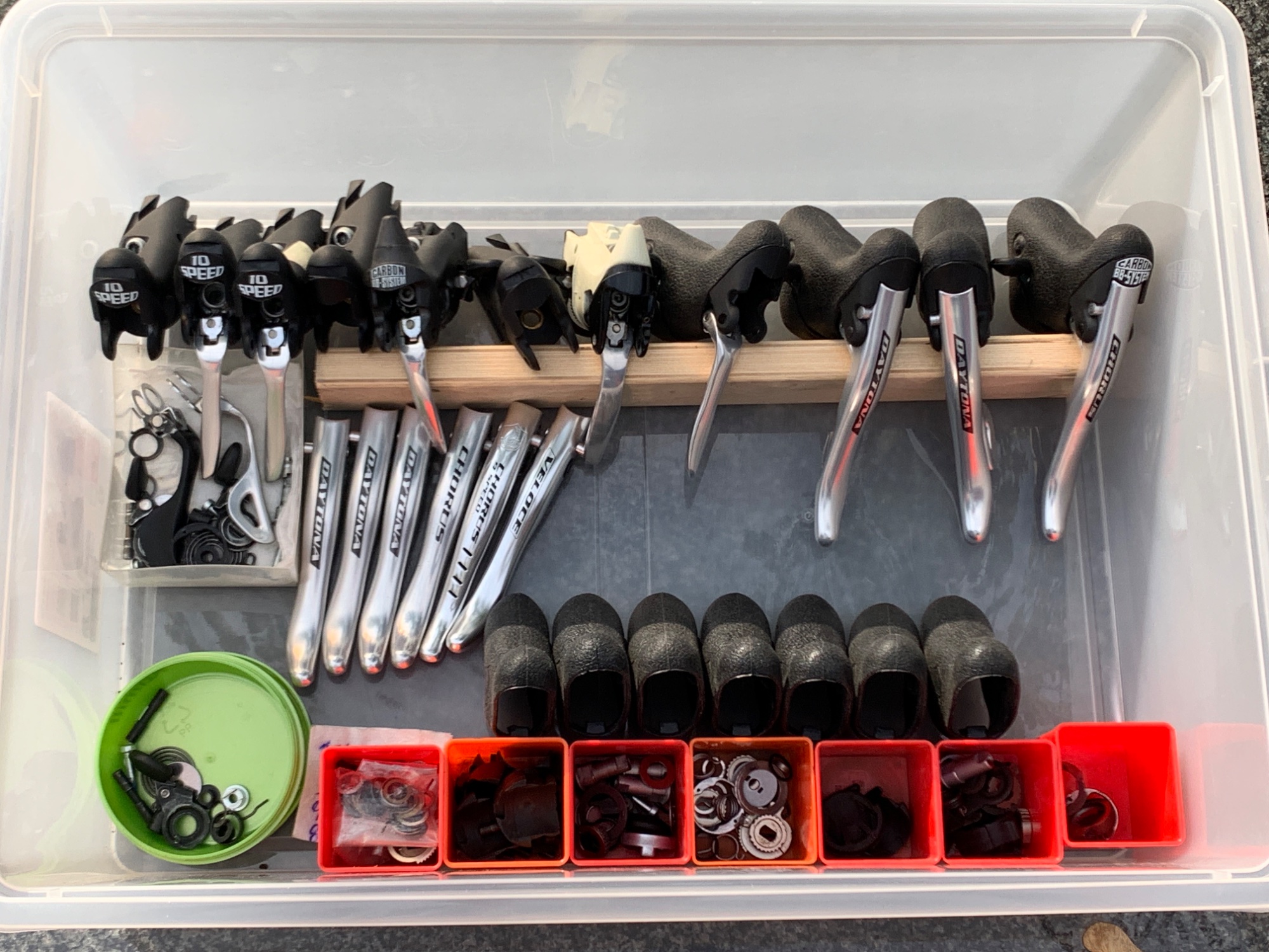 Ich gedenke, mich von diesem Konvolut an Campagnolo Ergopower Teilen zu trennen, da ich das Puzzle ja doch nicht puzzlen werde. Die Teilen wirken auf mich alle wie neu, ich habe allerdings keine detaillierte Begutachtung durchgeführt und würde den Kram daher eher als ,,sehr sehr gut" verkaufen. Ich fasse den Inhalt mal grob zusammen: