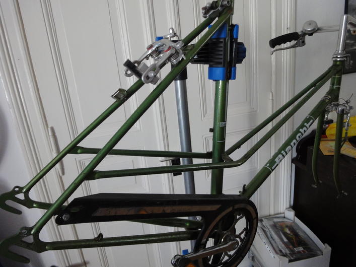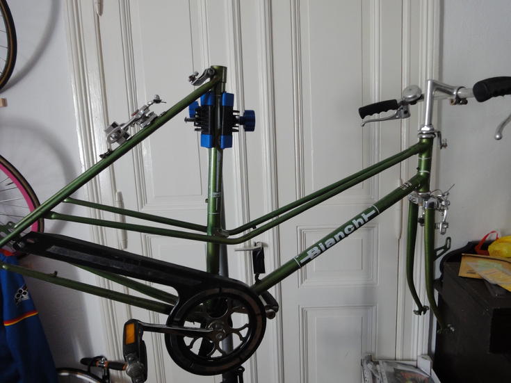 ich wollte den Rahmen vor einer Weile für meine Freundin als Winterrad aufbauen. Ich habe aber dazu keine Zeit gefunden und jetzt steht er im Weg. Bianchi Rahmen, Weinmann Bremshebel und Dia-Compe (610/750) Bremsen. Fehlt nur die Kabelei und Laufräder. Zustand ist nicht der Beste, eben als Winterrad gedacht...