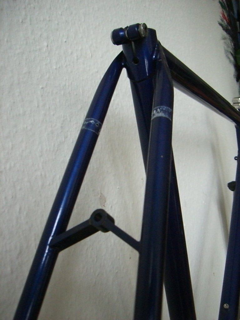Also der hintere Bremssteg spricht meiner Meinung nach nicht für was "günstigeres". Ist recht filigran und auch nicht so Standard.Da wirst Du wohl nicht viel weiter kommen. Das Rahmengewicht mit den Anbauteilen und einer fetten Lackschicht ist nur sehr begrenzt verwertbar. Die Maße sind standard oversized Rahmenrohre, das Sitzrohr paßt auch zu etwas mittel- bis hochwertigem, ColumbusThron, auch Reynolds 531/631 wurde/wird (im Bedarfsfall) mit oversized Oberrohr verbaut. Das und die Führungen für die Schaltkabel am Steuerrohr verlegen den Rahmen in die Zeit ab den 90ern (STI/Ergopower). Die Führung des Bremszuges im Oberrohr ist aufwendig, die hinteren Ausfaller sind keine Bleche und auch mit Sinn für's Detail in die Kettenstrebe eingelötet. Die gepresste und etwas billig anmutende Innenlagermuffe und der Bremssteg sprechen dann schon wieder für etwas Günstigeres. Da jeder Rahmenbauer diese Teile auch heute noch genauso aus der Kiste ziehen könnte, also keine signature cuts vorliegen, wird die Herkunft im Dunkeln belieben, auch wenn ITA Innenlager nach Italien zeigt.