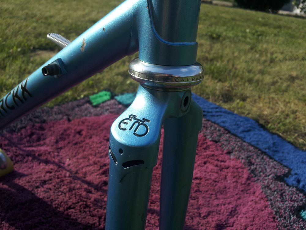merckx corsa extra, columbus slx, lack schon mit einigen macken, campa innen- und steuerlager bleiben dran: