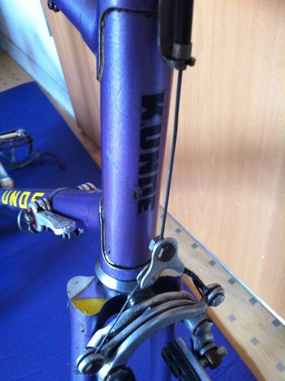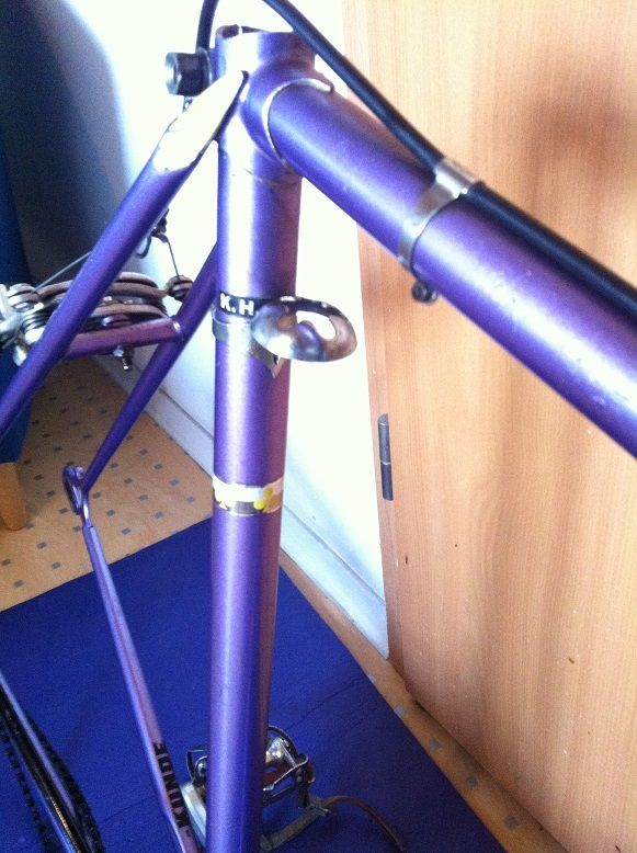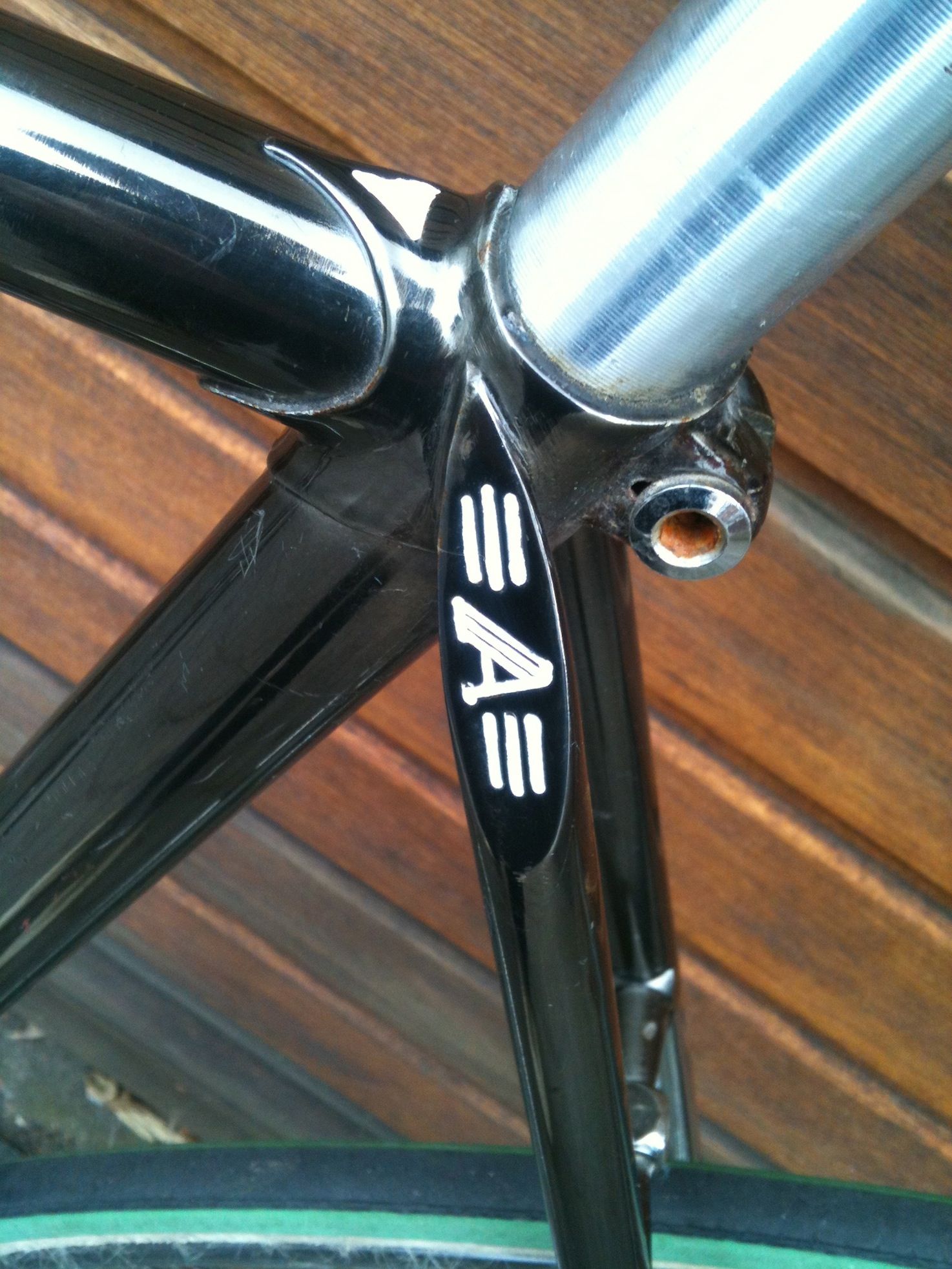 Der Rahmen ist ziemlich leicht, chromovelato lackiert, keine Prägung in den Ausfallenden, innenverlegter Bremszug, Columbus Gabel mit Täubchen Panto, Steuersatz shimano 600.