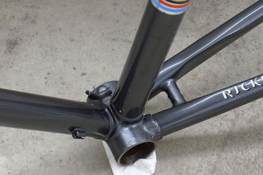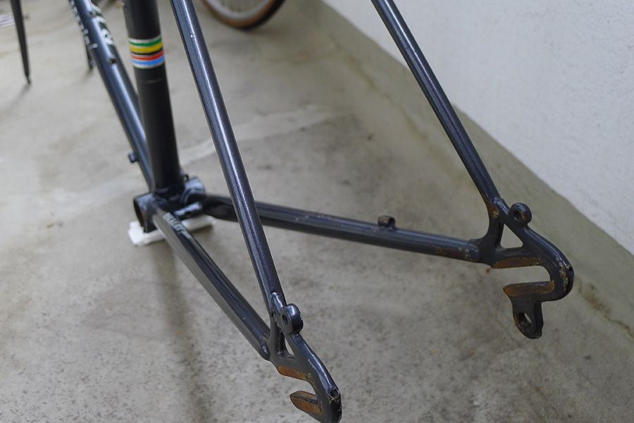 Der Rahmen ist denke ich älteres Baujahr, war aber wie es scheint in den frühen 80ern zurück in der Werkstatt zum auffrischen. Man sieht deutlich, dass der Meister keine Lust zum ordentlichen Entlacken hatte, sondern das zu dem Zeitpunkt wohl moderne dunkle Metallic-Grau einfach über das alte Vollblau drübergeknallt hat. Das allerdings trotzdem in einer satten und beachtlich gleichmäßigen Qualität.