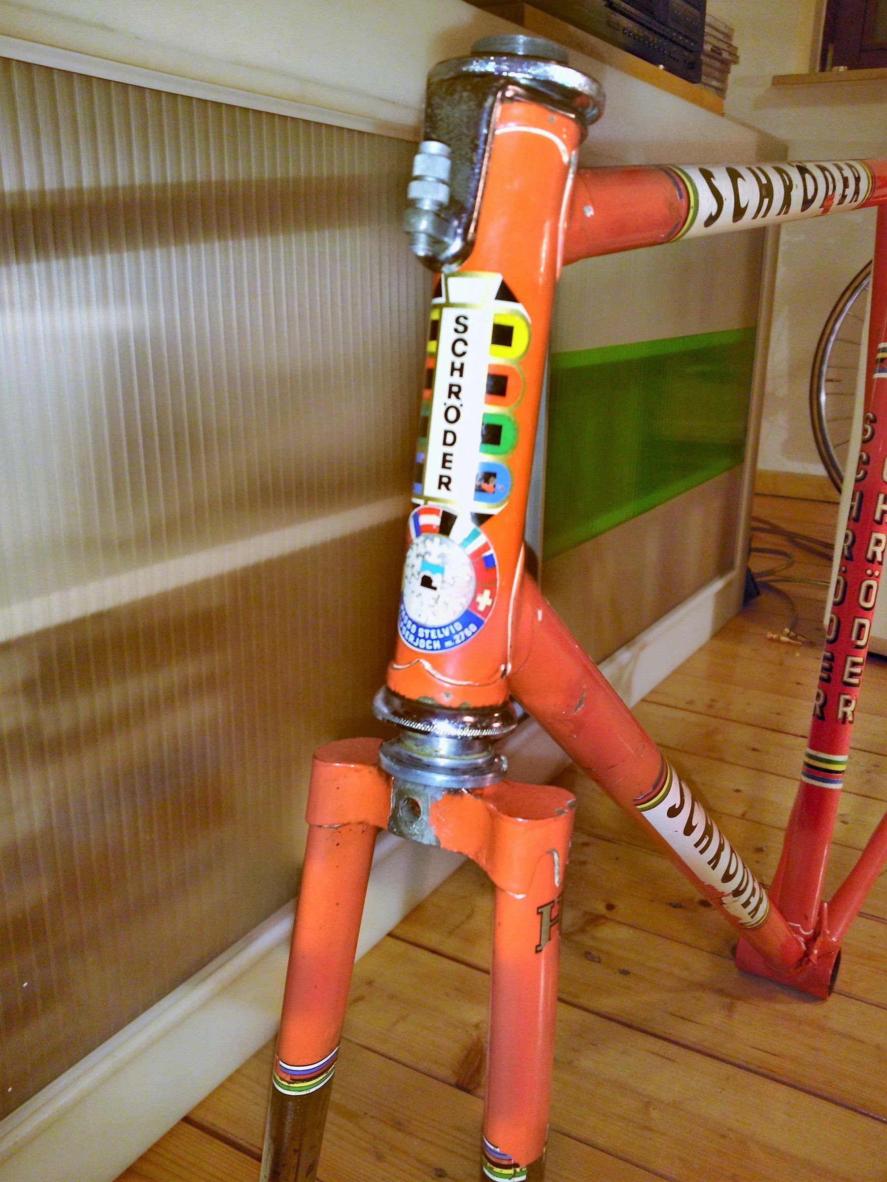 Wenn ich den Rahmen in einen passablen Zustand versetzt habe mache ich mal vernünftige Bilder. Dann werde ich auch Herrn Buthmann anschreiben, vielleicht hat er ja Lust von der Geschichte des Rades zu berichten. Es hat bestimmt eine bewegte Vergangenheit, zumindest lassen ein 'Passo Stelvio' Aufkleber am Steuerrohr und ein 'Euraudax' Aufkleber am Unterrohr das vermuten. Das Rad ist/war mit einer Nuovo Record- Schaltung und Kurbel ausgestattet, die ich aufgrund der deutlichen Gebrauchsspuren für die Originalausstattung halte. Das Schaltwerk trägt den Patent- Schriftzug ohne Jahreszahl, lt. Velobase also Jahrgang 68 oder 69. Es waren 2 unterschiedliche Laufräder verbaut, vorne mit No Record- HF- Nabe, hinten mit Nuovo Tipo NF. Da muß ich Daten auf den Kontermuttern noch prüfen.