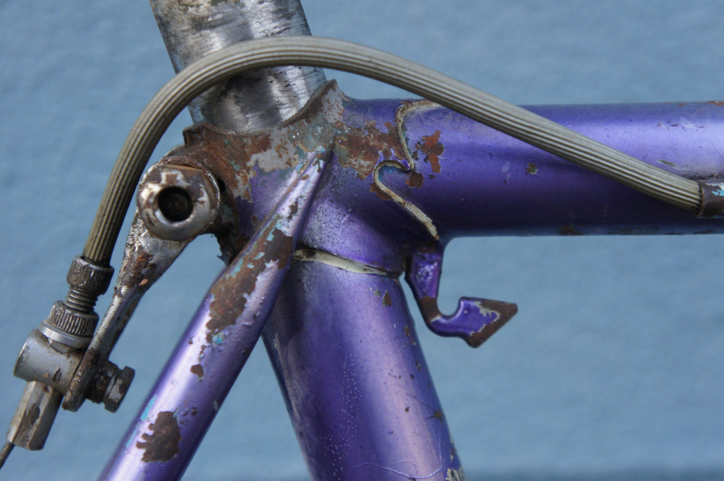 Der Lackzustand ist optimal und Chrom auch, nur eine Macke gibt es. Der Vorvorbesitzer hat mal gesägt um das Fixi hochzuhalten. Stört mich jetzt aber nicht...soll ja wieder ein Fixie werden!(Ironie off)
