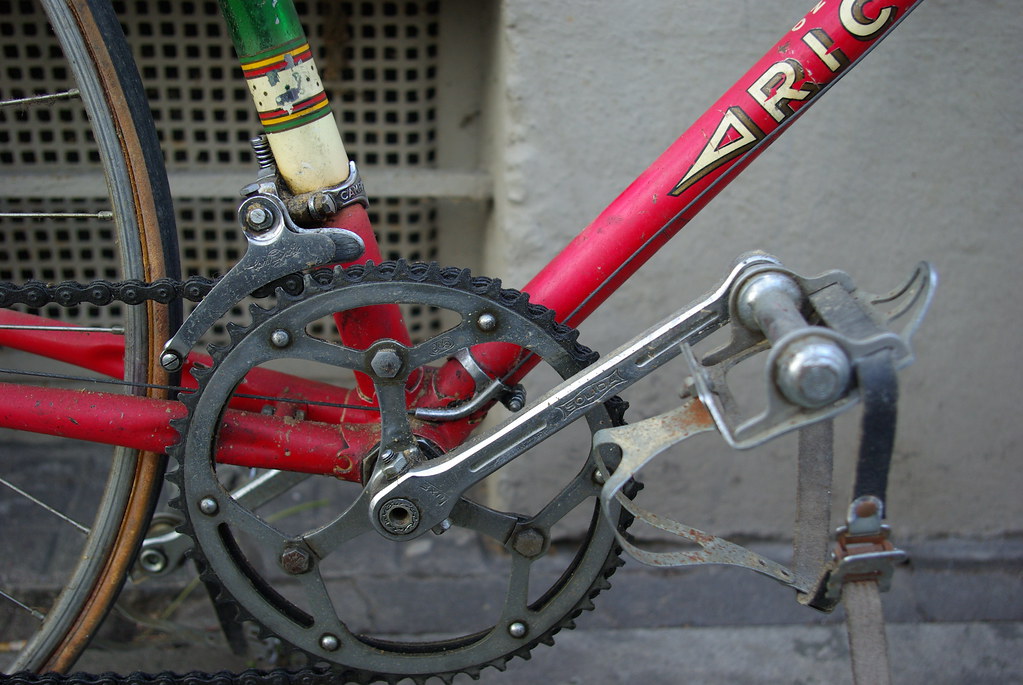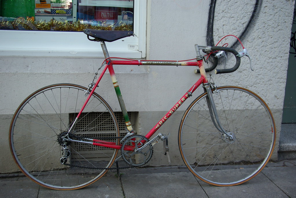 Noch vor Ort klebte ich (das erste Mal) neue Schlauchreifen auf die Felgen und dann ging es auf eine kleine Runde um die Außenalster. Das Rad passt mir perfekt, genau so gut wie mein blaues Rickert Spezial. Morgen werde ich nur noch die Haken gegen etwas längere austauschen. Habe noch ein paar Neue von Christophe da. An die Halfstep Kurbel vorne habe ich mich auch schon gewöhnt. Hinten habe ich immerhin 4 Ritzel zwischen 14 und 21 Zähnen zur Verfügung. Schätze das FBL auf die Zeit um 1959 herum. Ausgestattet ist das Rad mit Campagnolo Gran Sport Schaltung und Universal Bremsen. Die Kurbel ist von Stronglight. Weiß aber nicht welches Modell. Der Sattel ist noch in gutem Zustand und von Brooks. Lenker und Vorbau von Maes Kint, bzw. Titan. Die Pedale sind von Lyotard. Der Rahmen wurde von Hugo Rickert für FBL Torino (Hübner und Koch) in Berlin gelötet und von Gunter Heidhus in Bielefeld lackiert.