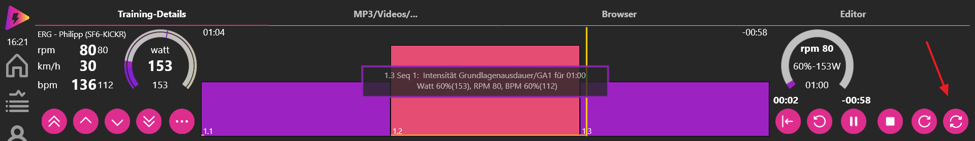 Neue Funktion in Version 2.3.58: Wenn man im CoolDown-Segment (also letztem Segment) angekommen ist, kann man ja nicht mehr vorspulen. Man kann nun aber in den "Freien CoolDown"-Modus wechseln, d.h. der CoolDown verlängert sich immer und immer wieder, wie im Freien Training bis man "Stop" klickt. Man erkennt dies auch daran, dass das Icon in dem Moment dann ein wenig anders aussieht: