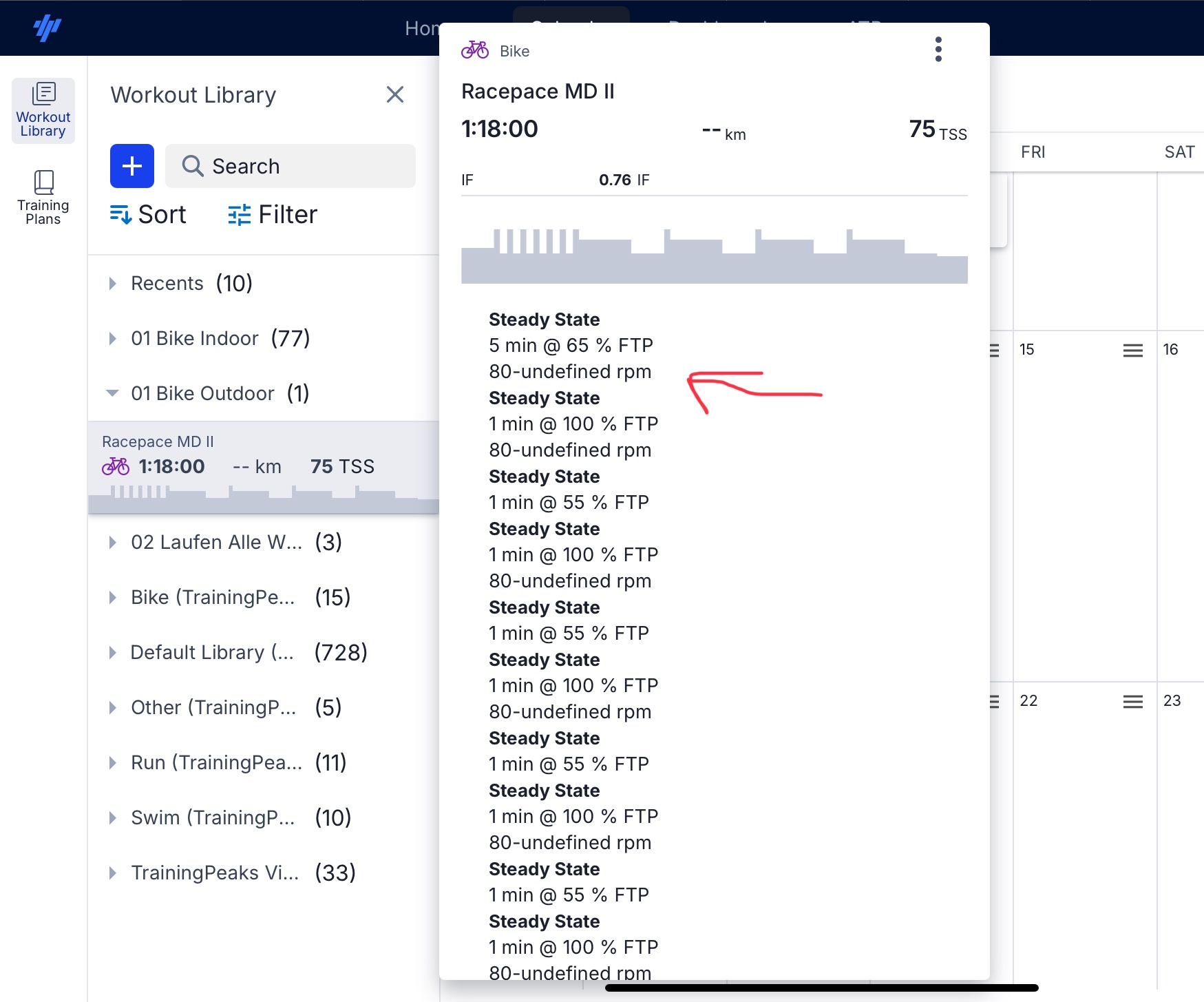 Was noch hinzukommt: wenn ich die rpm im Feld stehen lasse und die Workouts in TrainingPeaks importiere, kommt immer „undefined rpm“.
