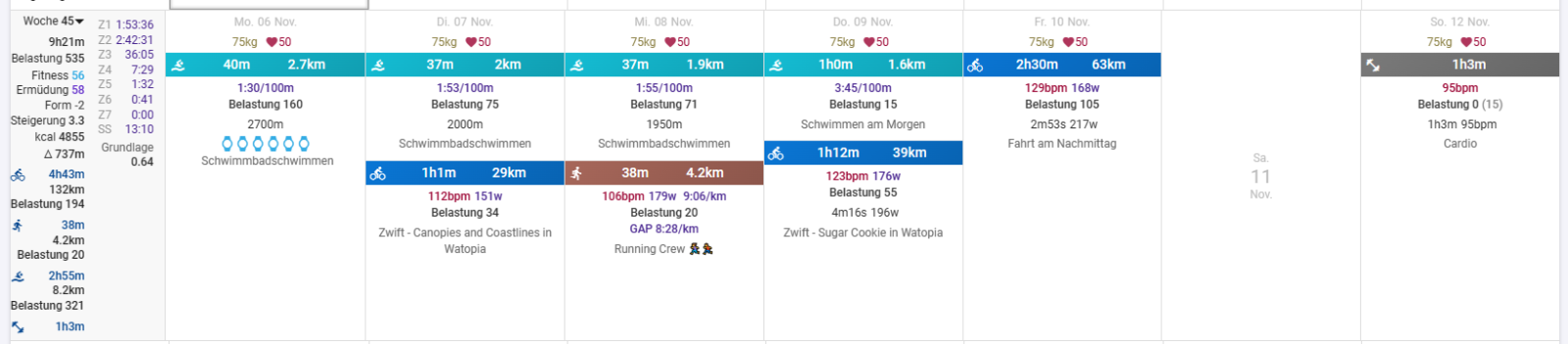 Geringe HF-Belastung und damit ein geringer TSS-Wert, in Abhängigkeit von der Herzfrequenz. Daher sagt die Garmin auch nur 300 kcal.Ich steige auch mal im Thema mit ein, vor allem finde ich die Kalenderfunktion ganz gut. Bei Garmin fehlt da ein bisschen was. Was mich aber wundert, obwohl ich am Sonntag das Krafttraining aufgezeichnet habe ist die Belastung relativ gering bewertet. Obwohl ich dabei alles gegebenen habe und abschließend noch ein Abschluss Fußballspiel……. Da habe ich heute ordentlich Muskelkater.