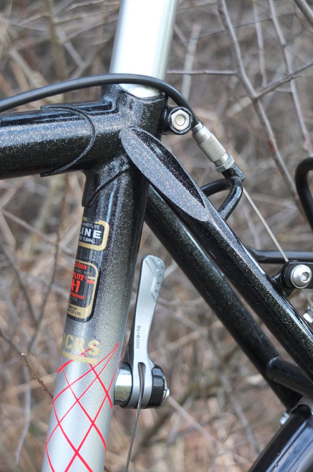 Also: Deshalb habe ich letztes Jahr im November dieses Teil ergattern können. Von einem netten älteren Mann, der damit nicht mehr fahren wollte. Das Ding war behutsam gepflegt und gelagert. Der Mann wusste wertvolle Dinge zu behandeln. Hat ja auch 'ne Stange Geld gekostet, damals. Das Kettenfett war gleichmässig über das ganze Rad verteilt und richtig schön ausgehärtet. Da habe ich tatsächlich alles komplett zerlegen müssen und in heißem Spülwasser waschen und bürsten müssen. Nix anderes ging. Tretlager musste neu, Pedalen mussten originale her. Haken und Riemen habe jetzt MKS - passt - und Die Hoods gab's bei DiaCompe. Die gehen soweit. FlaHas mache ich noch andere (Elite), aber ansonsten steht's ganz gut da. Mein erster und letzter Alu-Renner: