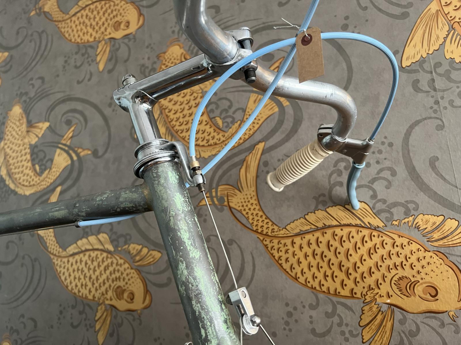 Ein frühes Bianchi Super Corsa von 78 . Der Portacatena musste aus Platzgründen dem nun montierten Laufradsatz weichen weil es schnell gehen musste um noch teilnehmen zu können ., gleiches gilt dem Lenkerband welches in naher Zukunft durch Leder ersetzt wird ..Eigentlich wollte ich es mit Mavic or Laufrädern zeigen .(s. letzte Bilder )