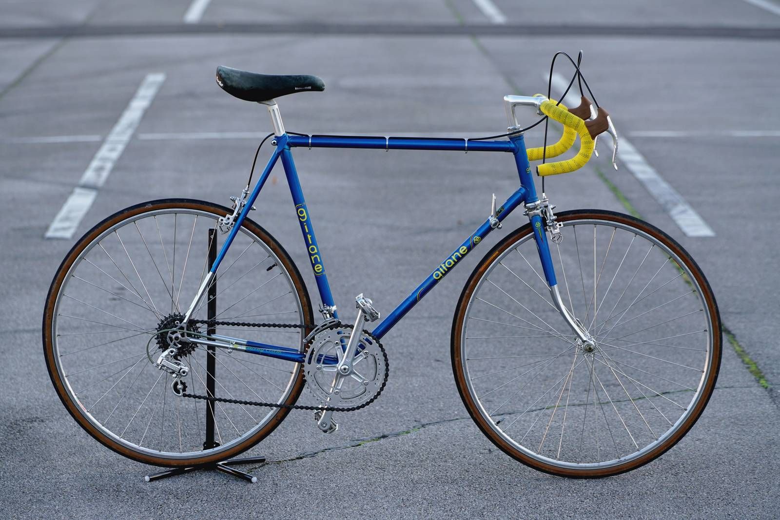 Was ich von dem Rad weiß ist, dass der Rahmen so zwischen 1974 und 1976 gebaut worden sein müsste. Er hat den für meinen Geschmack schönsten gelben Gitane Schriftzug und es ist, nach den Details, das Modell „Super Olympic“. Verkauft wurde das Rad aber erst 1983 in Süddeutschland und zwar aufgebaut mit der ersten Shimano Dura Ace Gruppe (mit der „Crane“ Schaltung), für DM 1.598. Schloss (DM 17,80) und Mütze (DM 3,20) gab es kostenlos dazu.