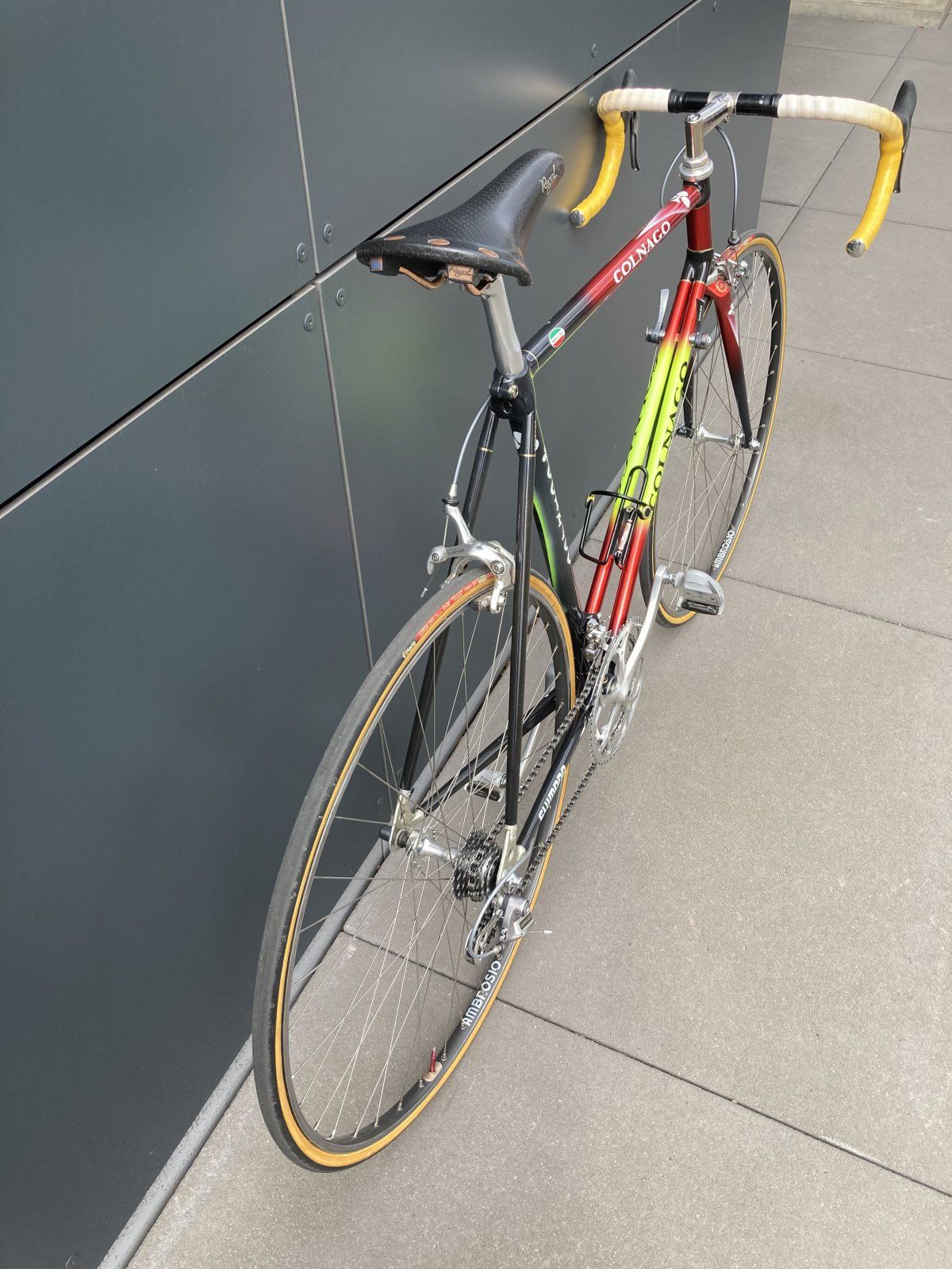 Als Arbeitsgerät nutzte er damals das Colnago Carbitubo von Ernesto. Das Carbitubo im Jahre 1989 entstand mit technischer Unterstützung von ALAN und der berühmten Scuderia aus Maranello mit dem Cavallo Rampante. Ende der 80s resp. Anfang der 90s war Colnago einer der wenigen italienischen Herstellern die auch mit anderen Materialien wie Stahl experimentierten so entstanden das C35 und das Carbitubo. Die doppelte Unterrohrkonstruktion des Carbitubo, welche später noch einmal beim Bititanio Anwendung fand soll im übrigen eine Idee des ehemaligen champion Guiseppe Saronni sein ...