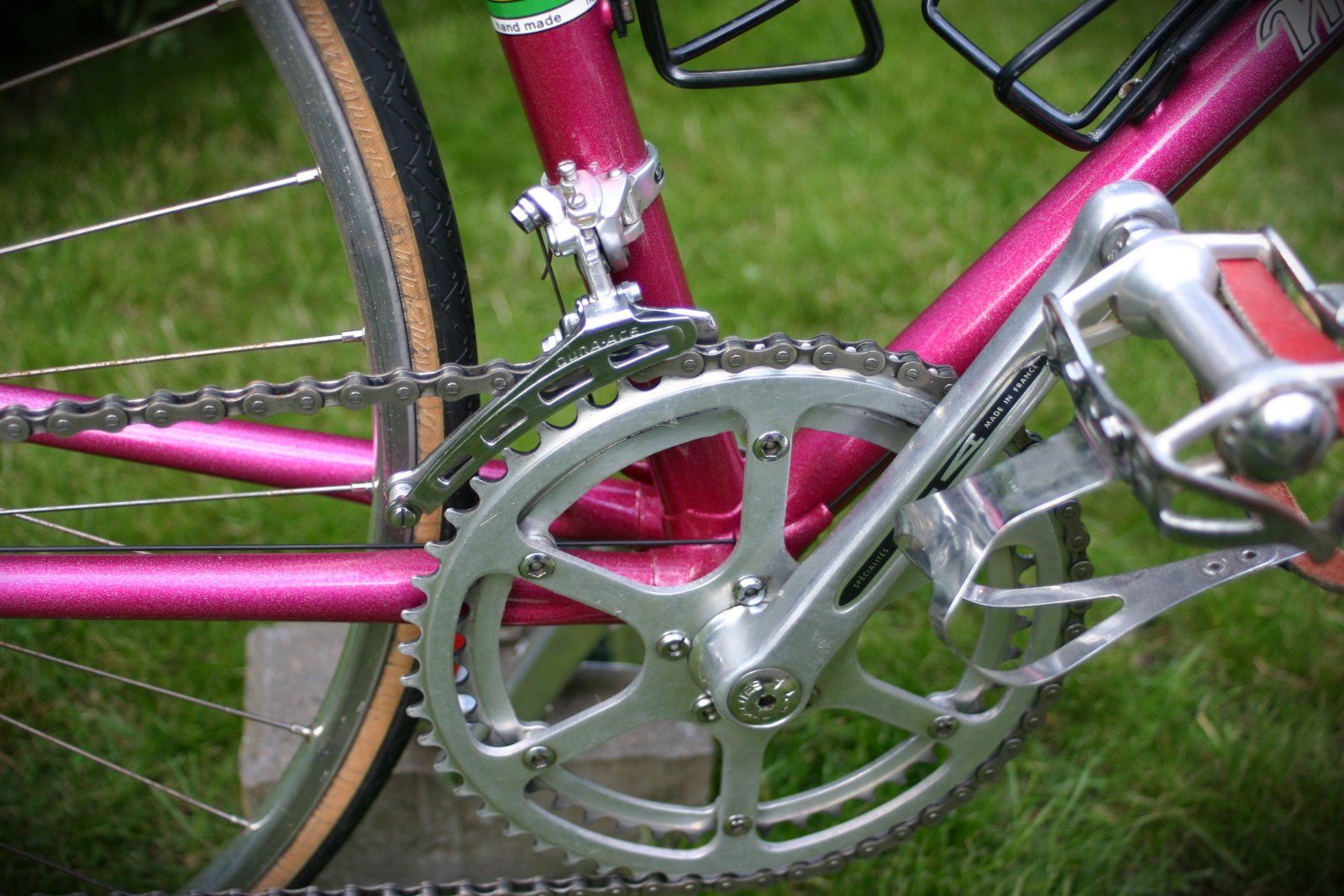 Die Felgen kommen von CBT Italia. Die Kette ist eine Bahnkette von Miche, genauer gesagt zusammengefügt aus zwei, weil eine aufgrund der langen Kettenstrebe zu kurz war ;) . Da die alten Bremszughüllen leider nicht mehr zu gebrauchen waren, habe ich kurzerhand Shimano Hüllen geschält, was der Bremsperformance sehr zuträglich war. Genauso wie der Wechsel von Korkbelägen auf diese alten " zweikomponenten"-Beläge.