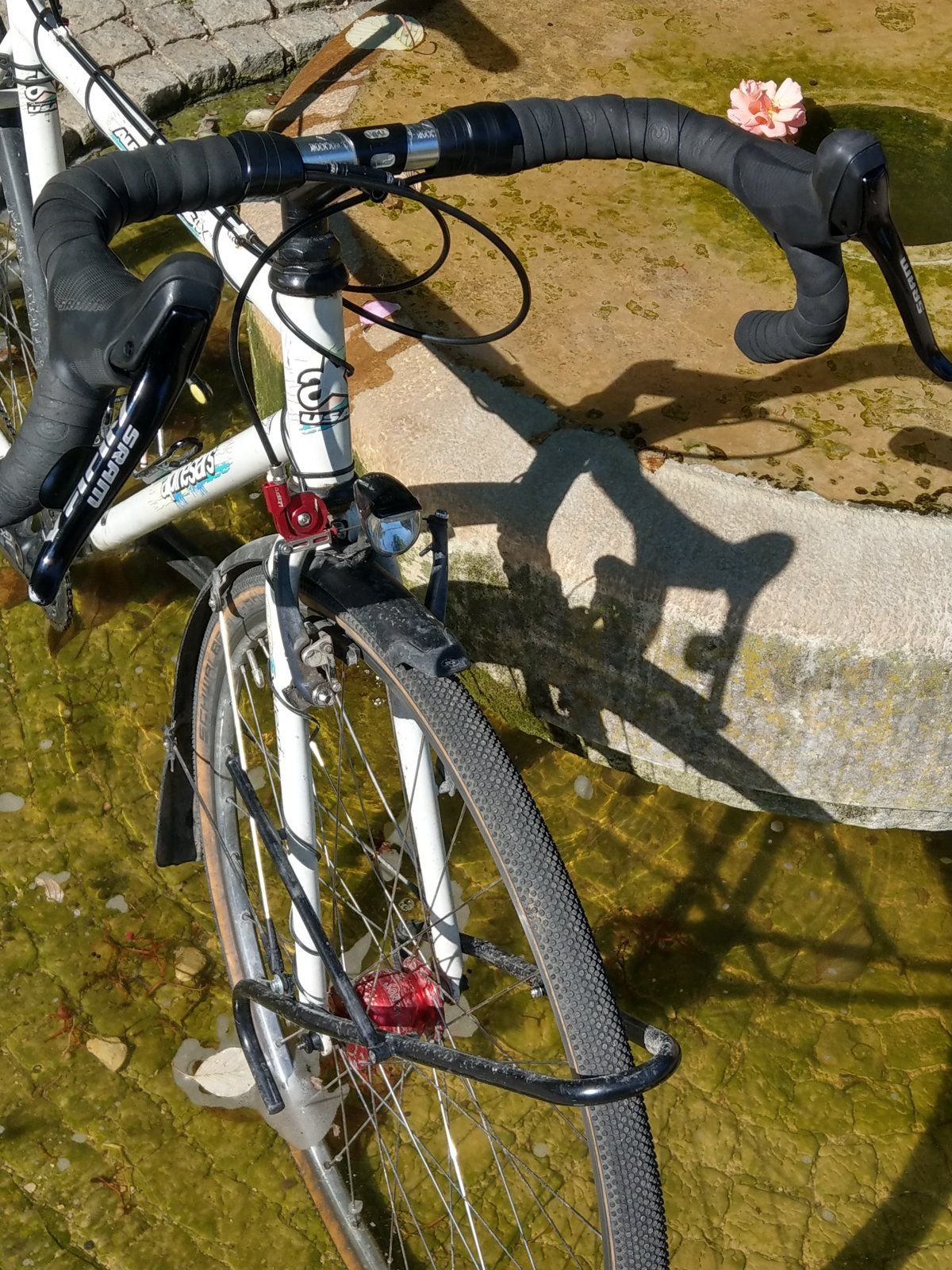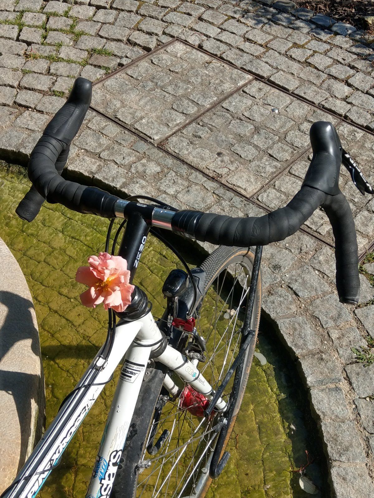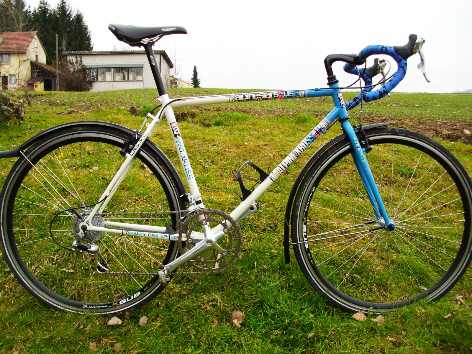 Dann werfe ich noch meinTrainingsrad für die AbendrundeFixie mit in den Ring. Sehr qualitativer Bahnrahmen von Fauss aus Köln aus den 1950s ... (@derMicha besitzt (?!) ein Bahnrad in Original Lackierung mit einem Zähler Unterschied bei der Rahmennummer) ... Hauptrahmen (Hinterbau wohl auch) komplett aus Reynolds 531 ... schön mit weißem Zuckerguss ... Gabel hab ich wegen Bremse von Diamant genommen (auch Bahn, aber von nem Fixieteur gebohrt) ... sehr funktionale und wertige Teile (Cinelli, Campagnolo, Stronglight, usw) ... Highlight ist auch das "Lenkerband" mit Dinos drauf...