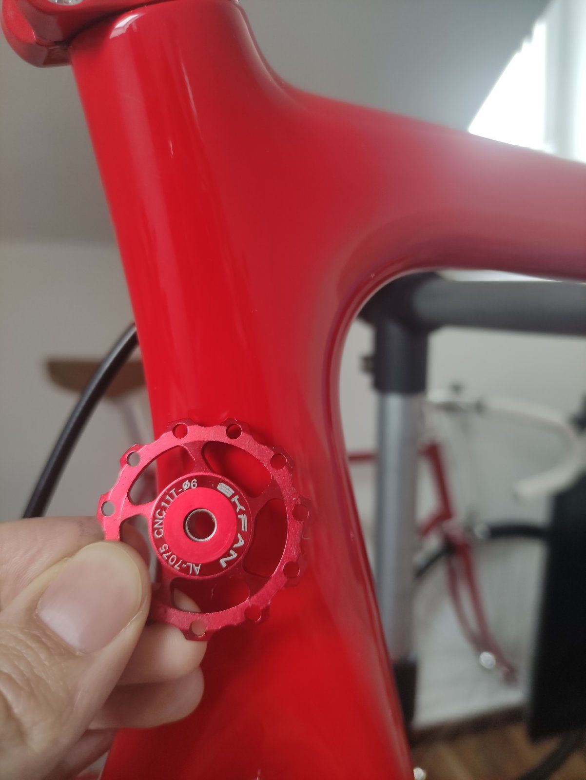 Ob sich das Rot mit dem Rahmen beißt, kann ich nicht sagen. Hier Mal ein Rot eloxiertes Schaltwerksröllchen. Vielleicht hilft das bei der Entscheidung.