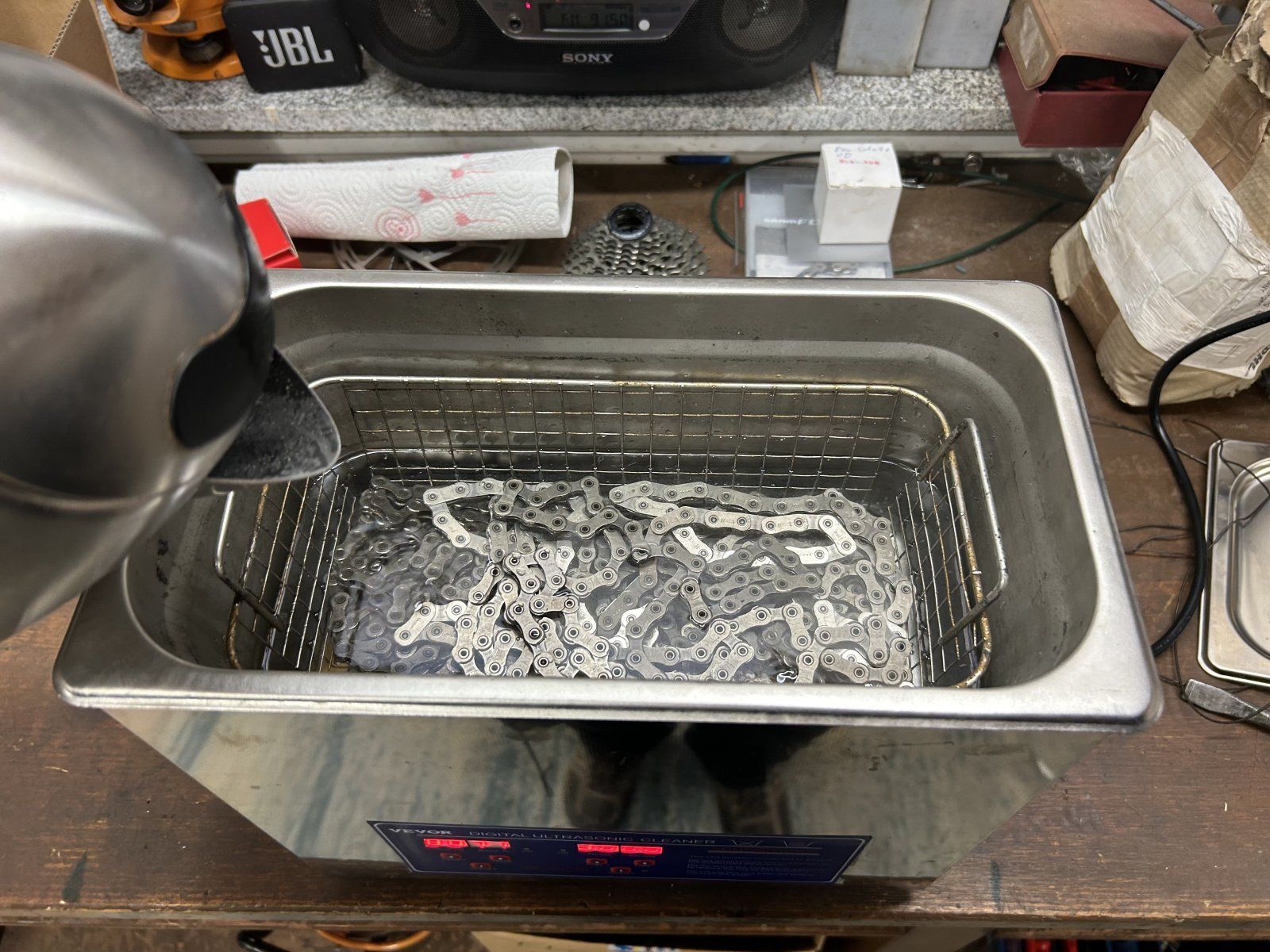 Die Sauerei, die entsteht, wenn man eine gewachste Kette nach 1000 km mit heißen Wasser übergießt, hab ich auf jedenfalls ordentlich unterschätzt. In meiner Lieblingsedelstahlschüssel mach ich das definitiv nicht noch einmal.