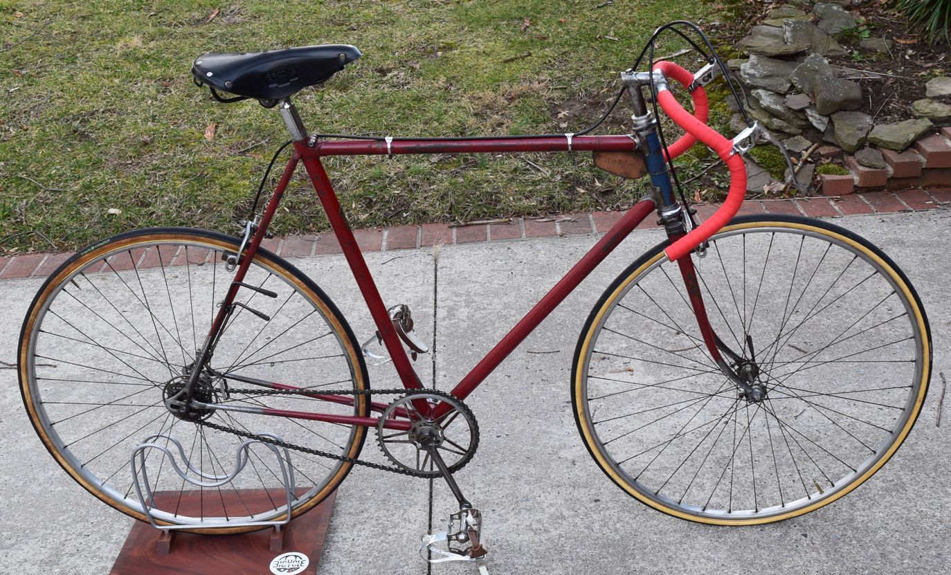 1947 Gerbi mit Campagnolo Corsa Schaltung. Laut die Konussen der Naben ist der Rad aus 1947 was auch mit der fehlende Aufklebern einigermaßen stimmen könnte. Das Lack ist ganz original und für seiner Zeit war das ein grosses Rad. Auf der Sattelrohr gibt es ein sehr hübsches Namensschilds. Vorne auf das Kopfrohr ein lackiertes Marke von Gerbi. Gerbi würde als roten Teufel bekannt. http://www.radsportseiten.net/coureurfiche.php?coureurid=3168