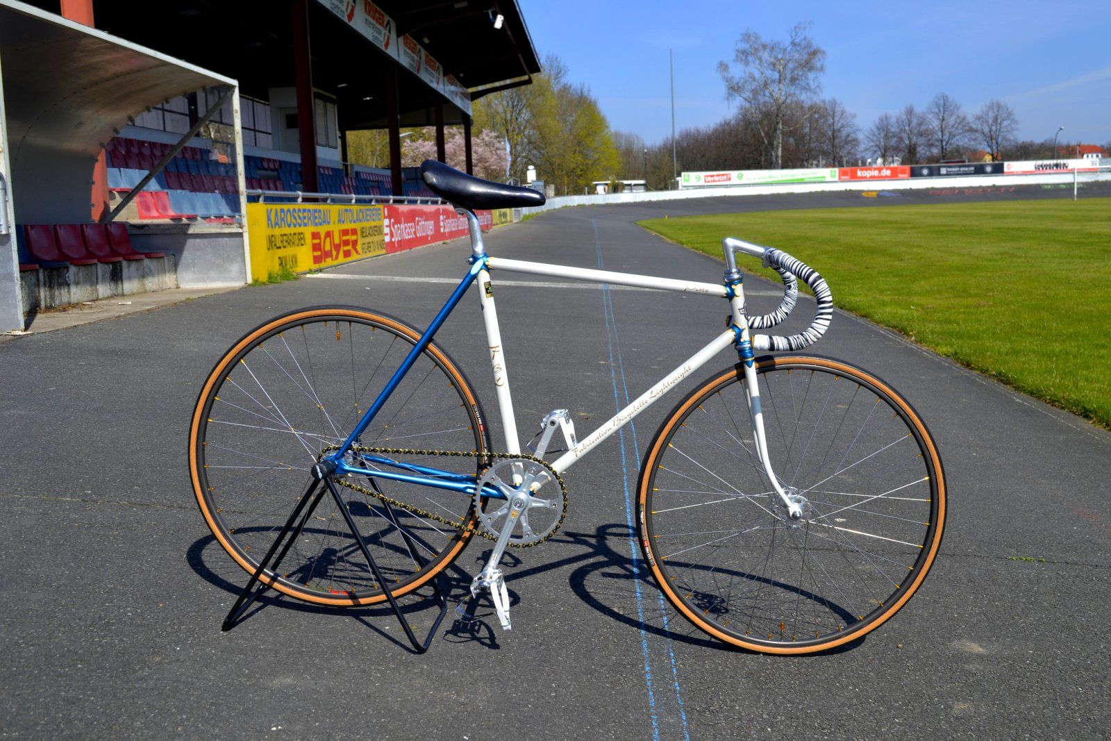 Ich präsentiere euch dieses Mal mein FES-Bahnrad aus dem Jahr 1988. Das erste „in Serie“ produzierte Modell des Instituts für Forschung und Entwicklung von Sportgeräten (kurz FES) aus Berlin. Die Formulierung in Serie steht in Anführungszeichen, weil es schon recht überschaubare Stückzahlen sind. Von diesem Modell wurden jüngsten Gerüchten nach 9 Stück gebaut, meines trägt die Nummer 6 unter dem Tretlager. Den Vorgänger, das Modell B-87, gibt es nur ein einziges Mal. Dieser war quasi der Prototyp (oder vielleicht auch Machbarkeitsstudie?) und nach erfolgreichen Untersuchungen ging dieser ein Jahr später mit einigen Modifikationen als B-88 in die Produktion.