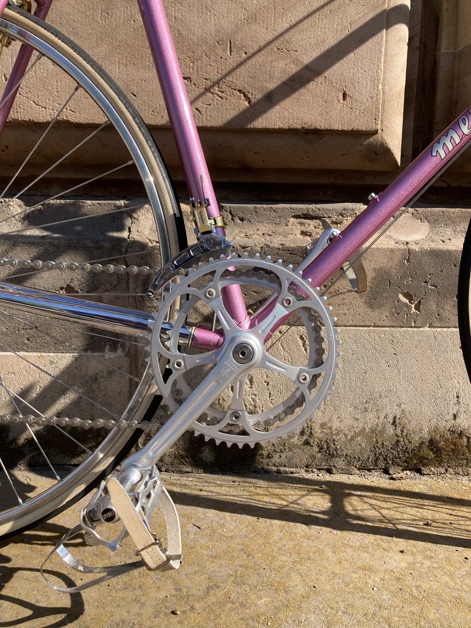 Das Rad kam vor einigen Jahren einmal mit einer etwas untypischen Campa Victory Gruppe zu mir. Sah eigentlich gar nicht schlecht aus, war aber trotzdem "emotional" unpassend. Ich hatte dann lange damit geliebäugelt den Rahmen mit Mavic aufzubauen, angelegt an die Räder des 1982/32 Coop-Mavic-Mercier Team um Joop Zoetemelk. Aber irgendwann lagen dann da diese Golden Teile bei mir auf dem Tisch, der rosa schimmernde Rahmen stand in der Ecke, und ich dachte mir "Warum nicht?".