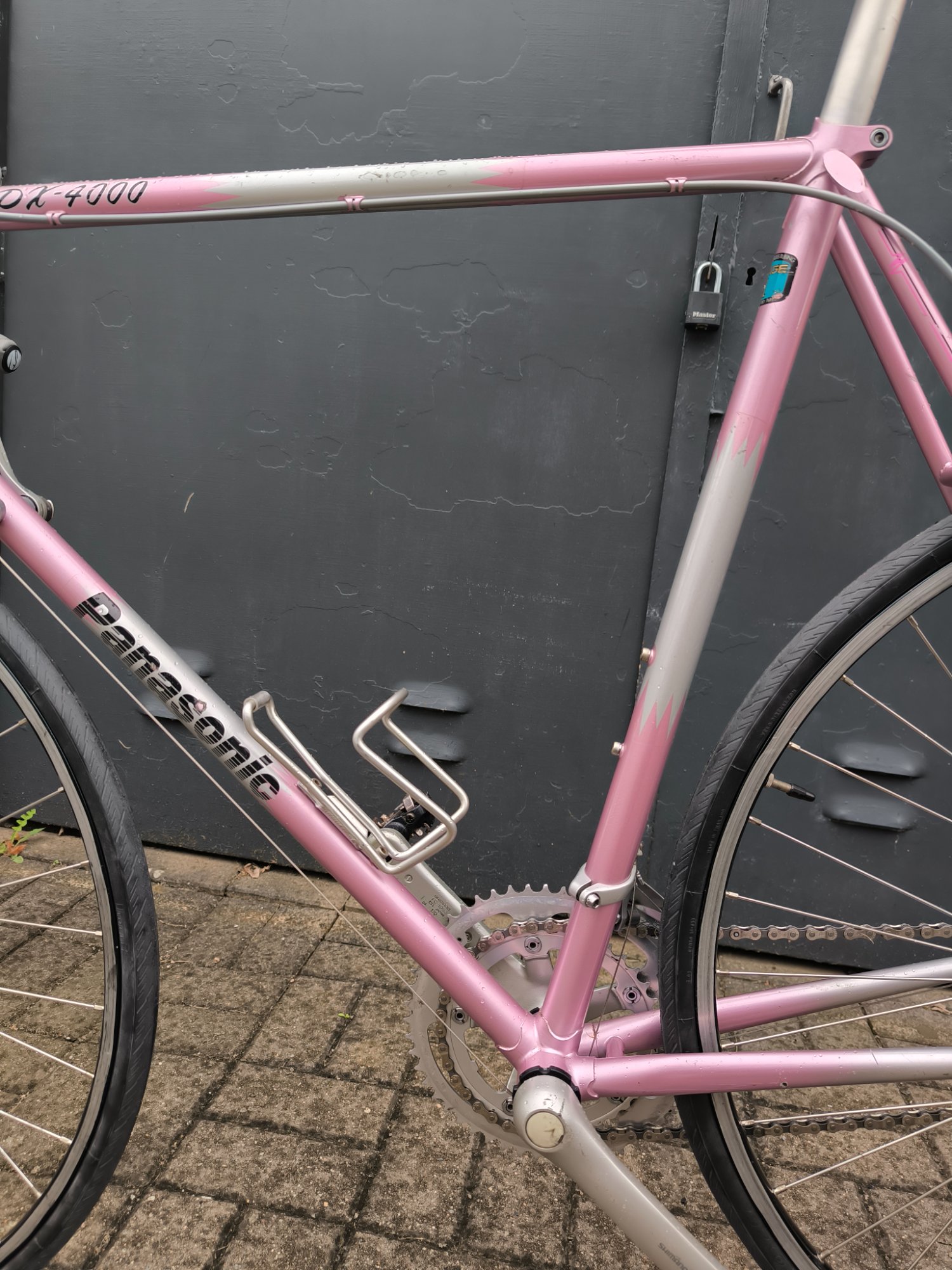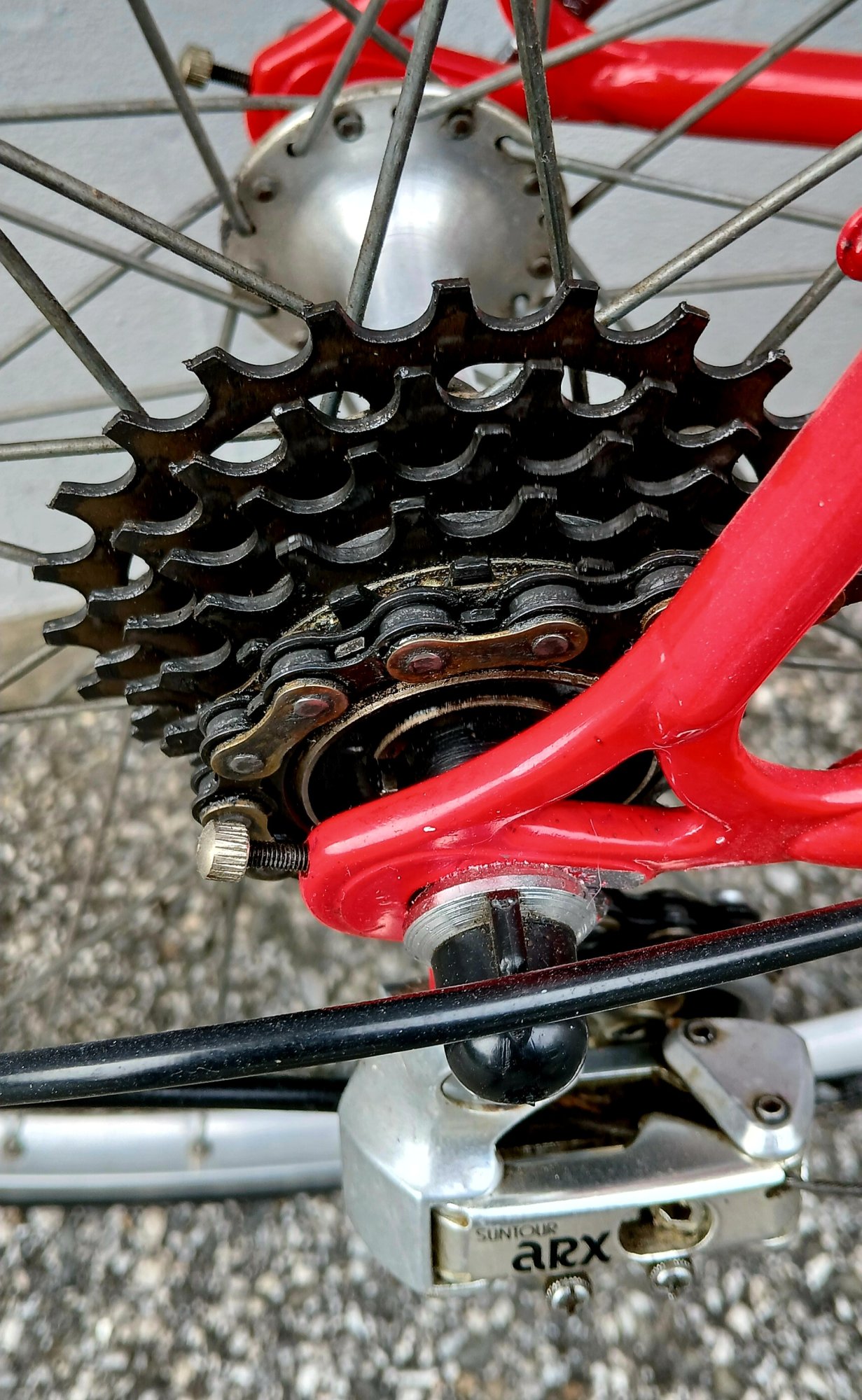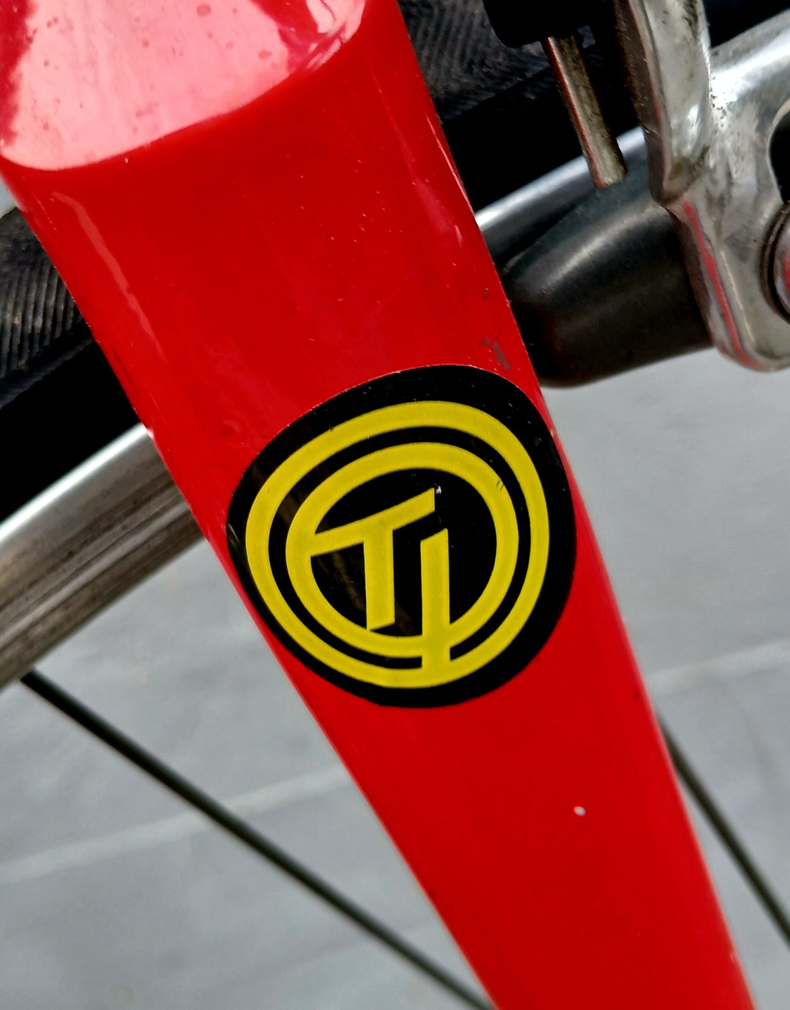 Rahmen ist Tange 1, die Höhe 60 cm c-t geschaltet und gebremst, ebenso 'genabt' und Lenkunterstüzt mit solider Shimano 105er, die Felgen Araya, Lenker und Vorbau von Sakae.
