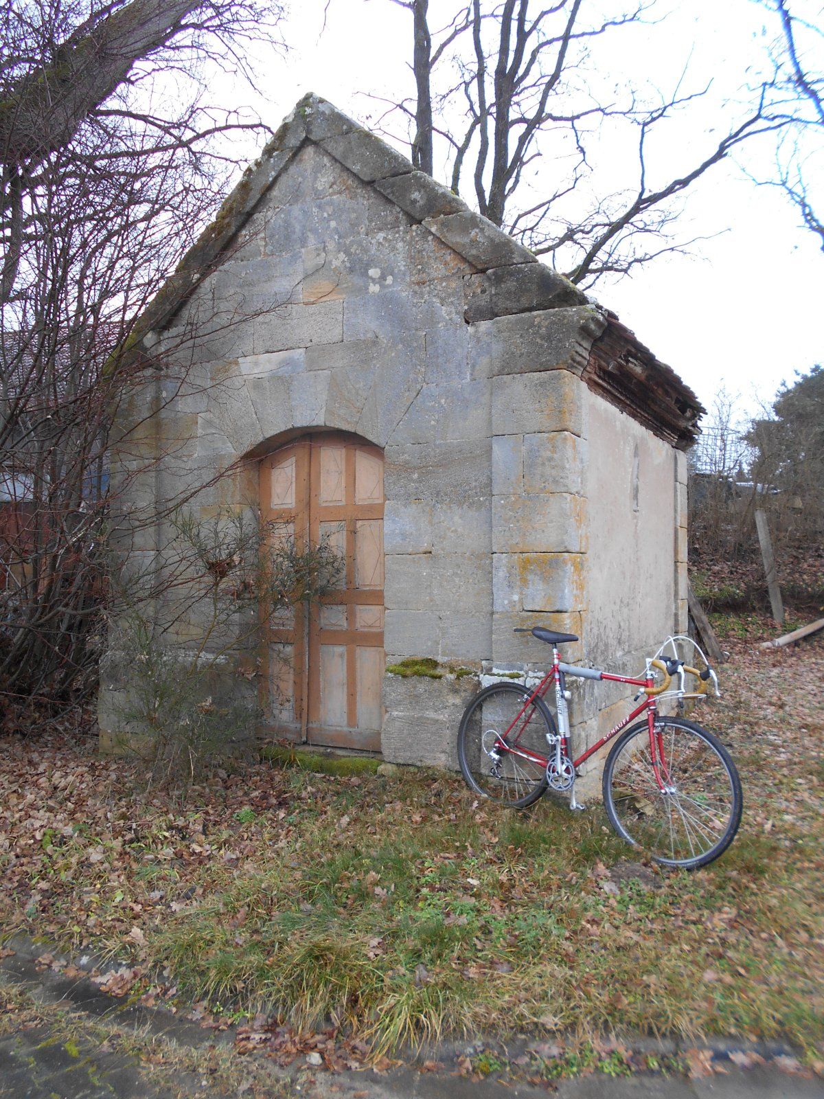 Da ist nichts außer einem brachen Gasthaus und einem Reiterhof. Aber nicht mit mir. Das Ablenkungsmanöver fliegt auf, als ich wieder auf dem Heimweg ein zweites mal durch den Ort komme und mich verfahre. Plötzlich stehe ich hiervor:
