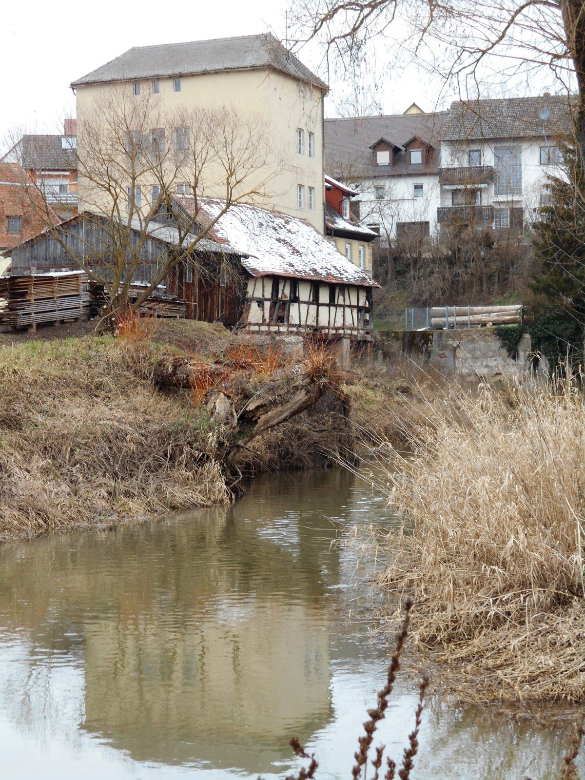 Im nächsten Ort ist die Mühle schon vollständig abgegangen aber neben dem ehem. Kloster zu Schlüsselau derer von Schlüsselberger findet sich noch an der Brücke der Ebrach eine Schneidmühle mit Sägehalle über dem Wasser.