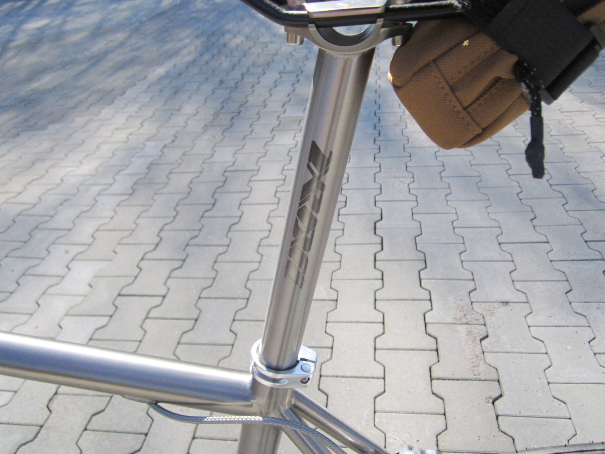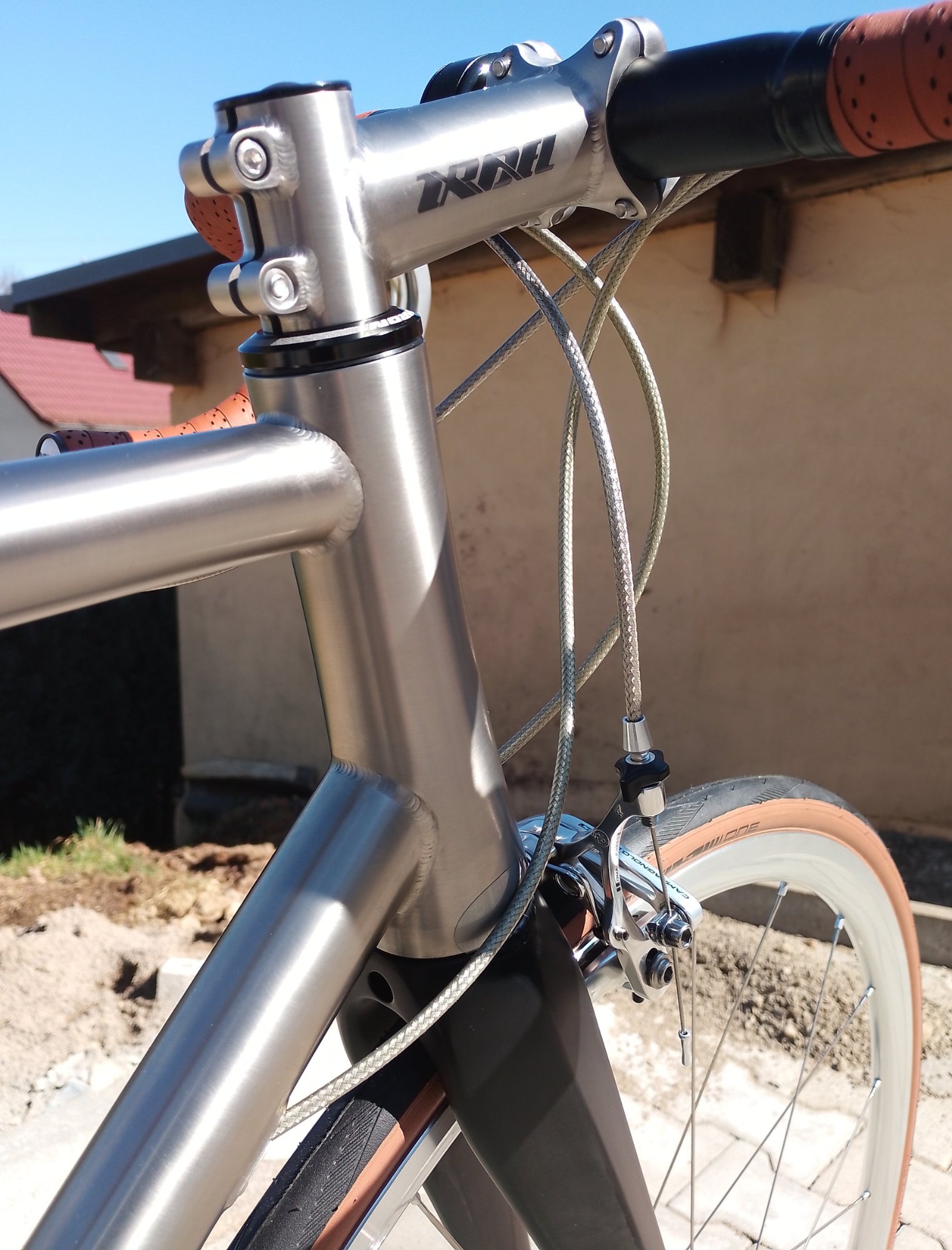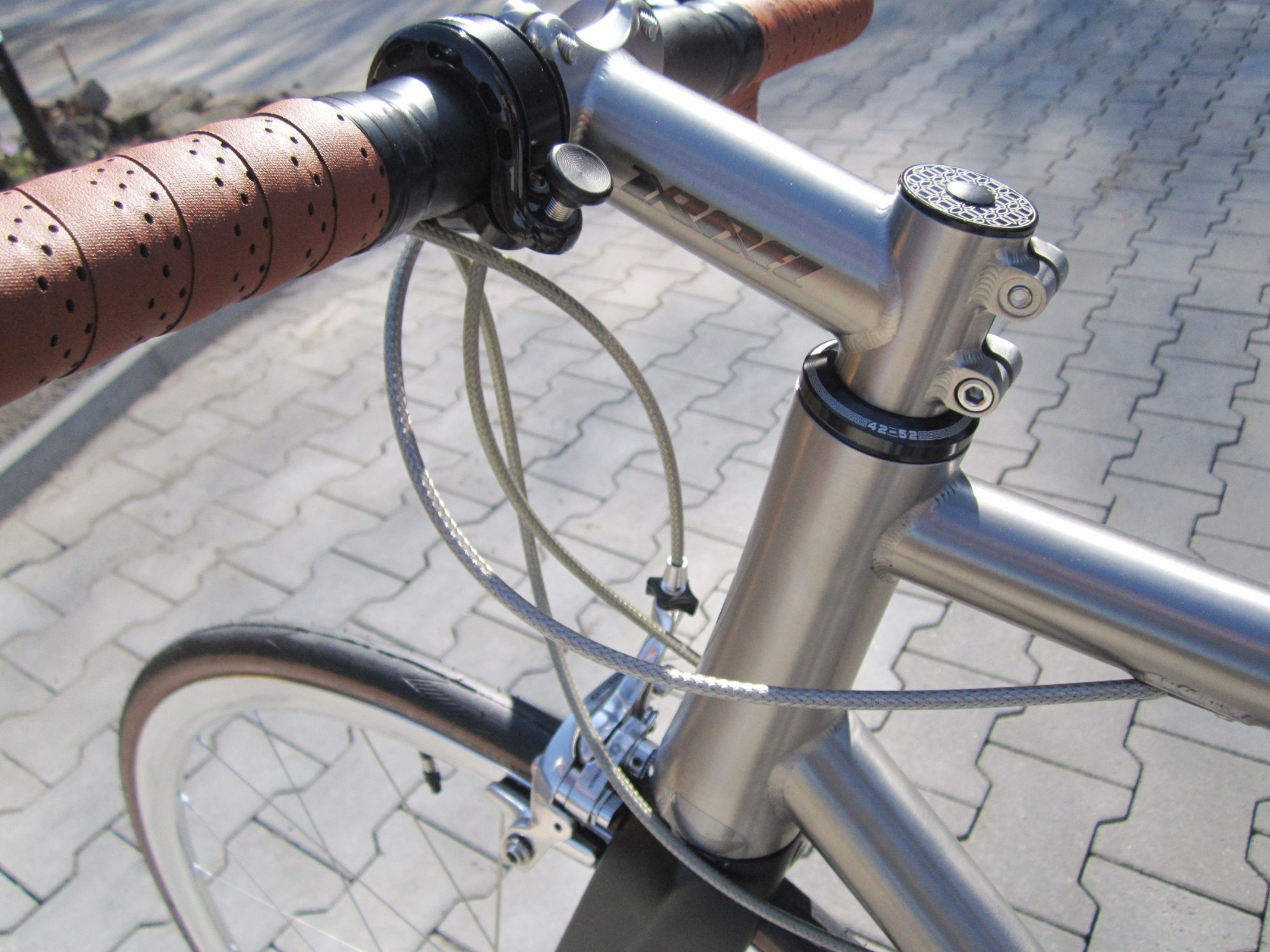 Die Laufräder sind mit Kinlin-Felgen XC279, Sapim CXRay-Speichen und Novatec-Naben aufgebaut. Hinten kam eine 2:1-Einspeichung zur Anwendung. Die Reifen sind bewährte Schwalbe ONE mit farblich passender brauner Flanke. Kombiniert wurden diese mit TPU-Schläuchen. Der Rahmen bekam vorm Aufbau noch passend zugeschnittene Schutzfolien (Kettenstrebe, Unterrohr, Steuerrohr) spendiert. Rahmen, Vorbau und Sattelstütze sind aus Titanlegierung und mit meinem neuen ZXRADEL-Logo versehen worden. Schaltung und Bremsen sind ausschließlich gut bis sehr gut erhaltene Gebrauchtteile von Campagnolo (Mix aus Centaur, Athena sowie Chorus). Die Centaur-Ergopower-Hebel wurden auf 11-fach Rastung umgebaut. Die 11-fach Kassette (11-30) sowie die Kette stammen im Übrigen von Shimano(!). Die (neue) Kette wurde nach 2-Stufen-Entfettungsbad (1x Waschbenzin, 1x Aceton) auf Wachsschmierung "umgerüstet". Gute Gründe (Form, Gewicht) sprachen beim Lenker und der Gabel für Carbonteile. Leider war bei letzterer die Schaftlänge sehr kurz ausgefallen (hatte ich beim Kauf wohl übersehen...), sodaß diese gerade so paßt. Leider konnte ich daher keine Spacer (entsprechende Titan-Teile liegen bereit) für eine etwas moderatere Lenkerhöhe verwenden. Vielleicht werde ich zukünftig doch noch eine andere Gabel mit längerem Schaft verbauen? Jedoch müßte ich mit der aktuellen Geometrie klarkommen, da sich diese kaum von der meiner übrigen Renner unterscheidet. Ach ja, Gewicht wie abgebildet (inkl. Pedalen, Satteltasche, Klingel und Flaschenhaltern) ca. 7,8kg.
