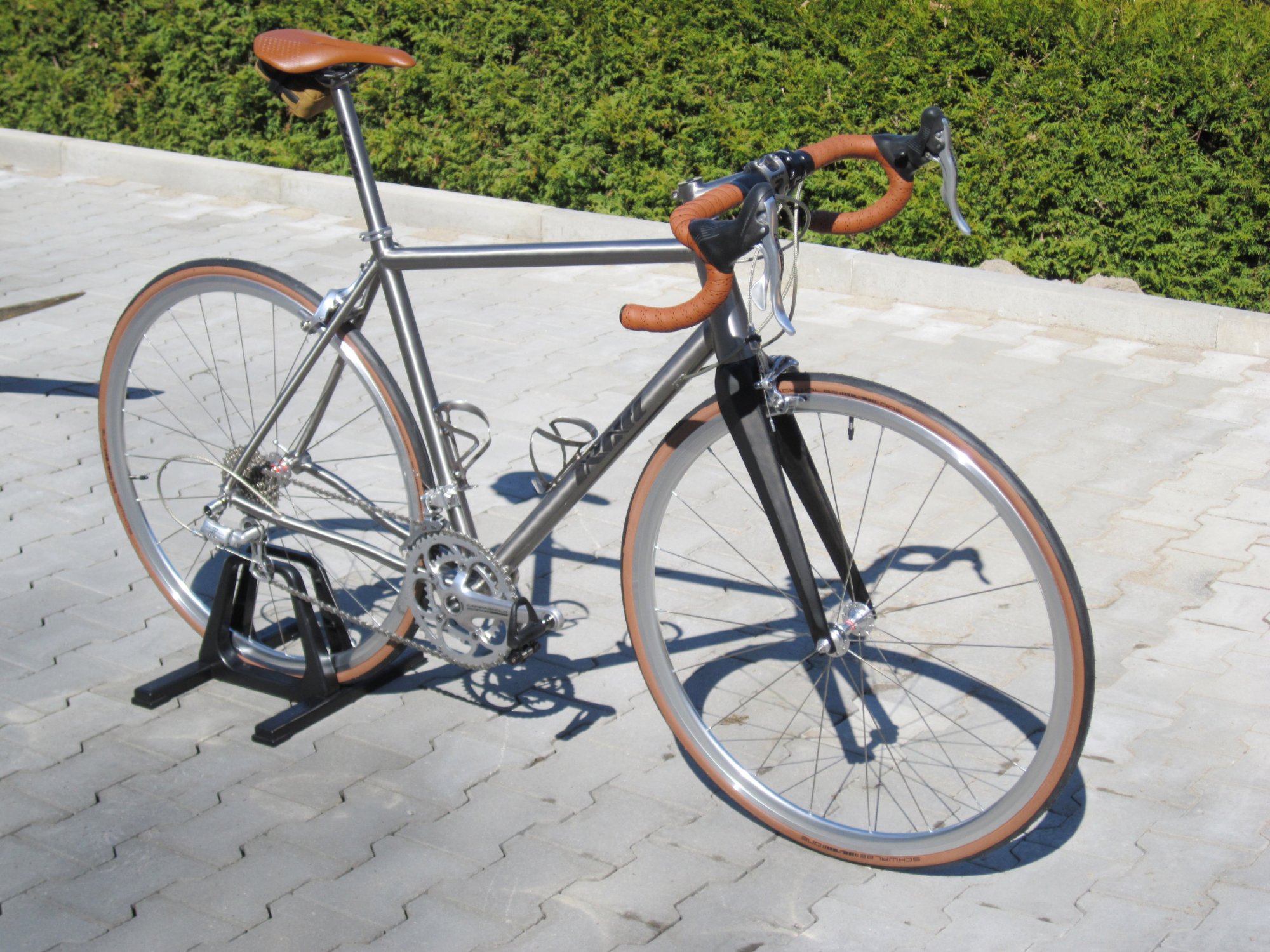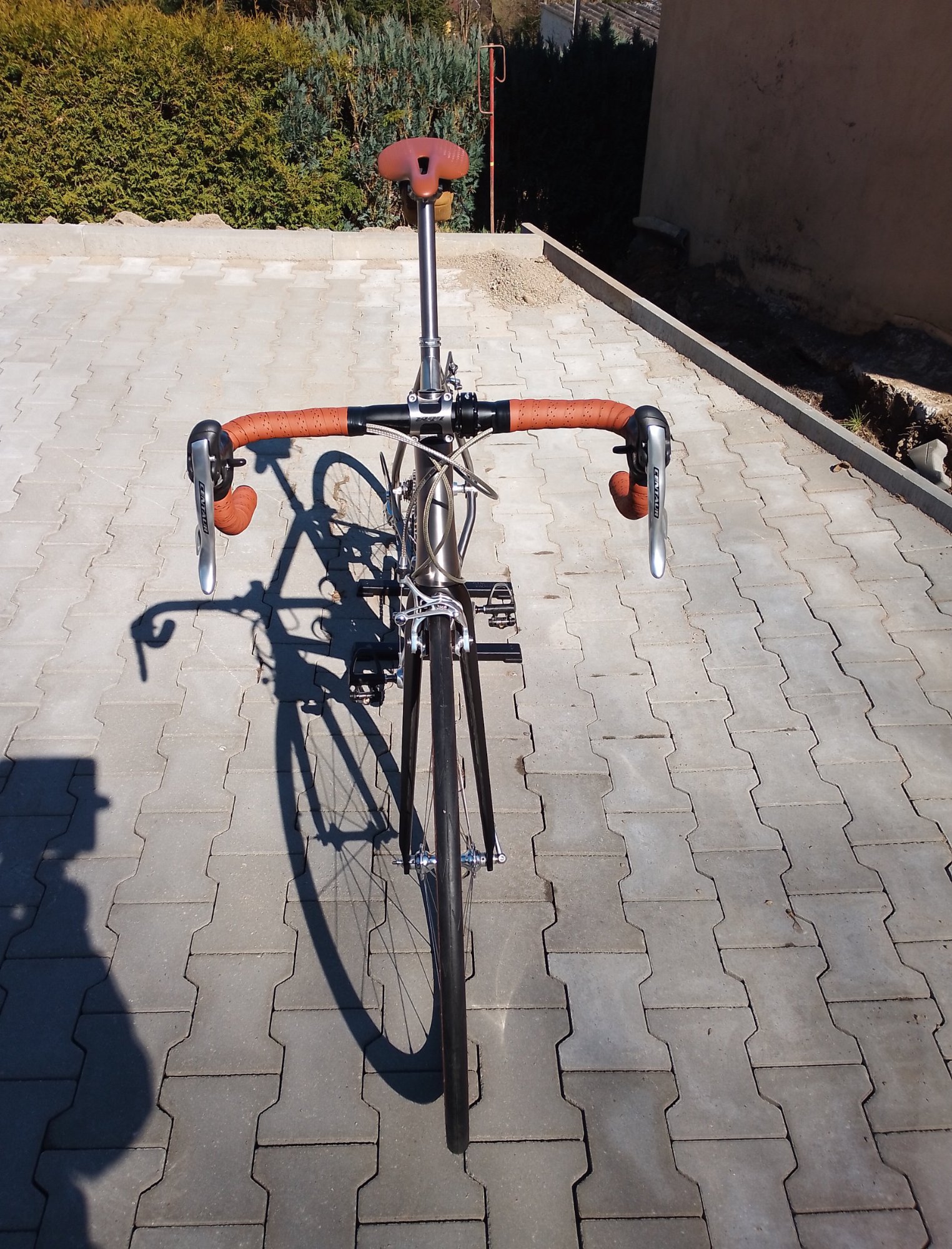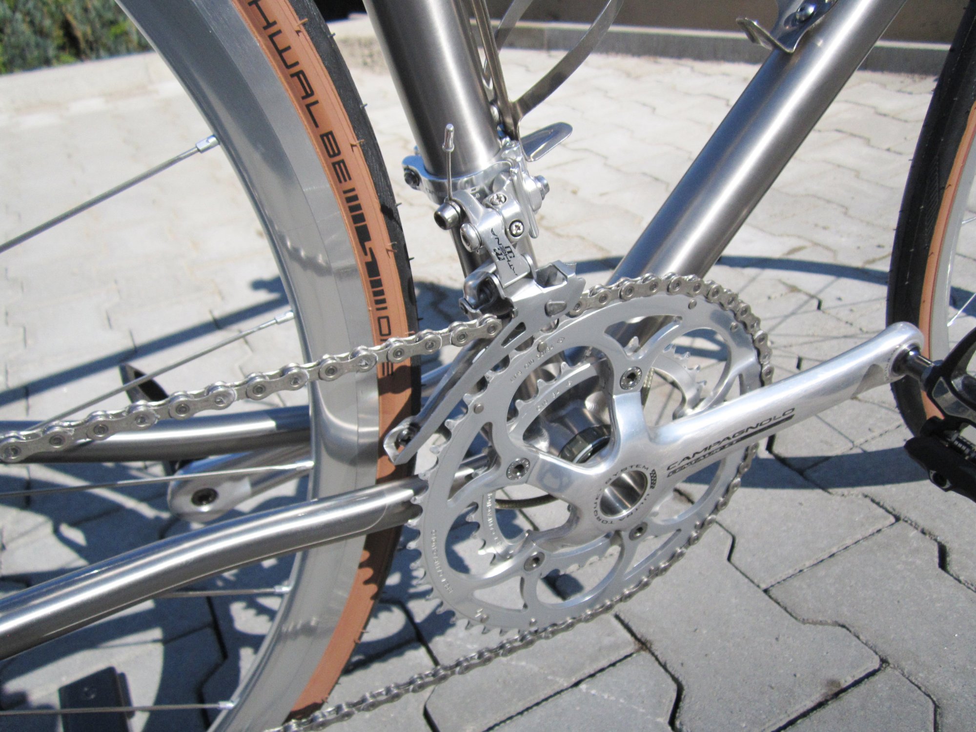 Die Laufräder sind mit Kinlin-Felgen XC279, Sapim CXRay-Speichen und Novatec-Naben aufgebaut. Hinten kam eine 2:1-Einspeichung zur Anwendung. Die Reifen sind bewährte Schwalbe ONE mit farblich passender brauner Flanke. Kombiniert wurden diese mit TPU-Schläuchen. Der Rahmen bekam vorm Aufbau noch passend zugeschnittene Schutzfolien (Kettenstrebe, Unterrohr, Steuerrohr) spendiert. Rahmen, Vorbau und Sattelstütze sind aus Titanlegierung und mit meinem neuen ZXRADEL-Logo versehen worden. Schaltung und Bremsen sind ausschließlich gut bis sehr gut erhaltene Gebrauchtteile von Campagnolo (Mix aus Centaur, Athena sowie Chorus). Die Centaur-Ergopower-Hebel wurden auf 11-fach Rastung umgebaut. Die 11-fach Kassette (11-30) sowie die Kette stammen im Übrigen von Shimano(!). Die (neue) Kette wurde nach 2-Stufen-Entfettungsbad (1x Waschbenzin, 1x Aceton) auf Wachsschmierung "umgerüstet". Gute Gründe (Form, Gewicht) sprachen beim Lenker und der Gabel für Carbonteile. Leider war bei letzterer die Schaftlänge sehr kurz ausgefallen (hatte ich beim Kauf wohl übersehen...), sodaß diese gerade so paßt. Leider konnte ich daher keine Spacer (entsprechende Titan-Teile liegen bereit) für eine etwas moderatere Lenkerhöhe verwenden. Vielleicht werde ich zukünftig doch noch eine andere Gabel mit längerem Schaft verbauen? Jedoch müßte ich mit der aktuellen Geometrie klarkommen, da sich diese kaum von der meiner übrigen Renner unterscheidet. Ach ja, Gewicht wie abgebildet (inkl. Pedalen, Satteltasche, Klingel und Flaschenhaltern) ca. 7,8kg.