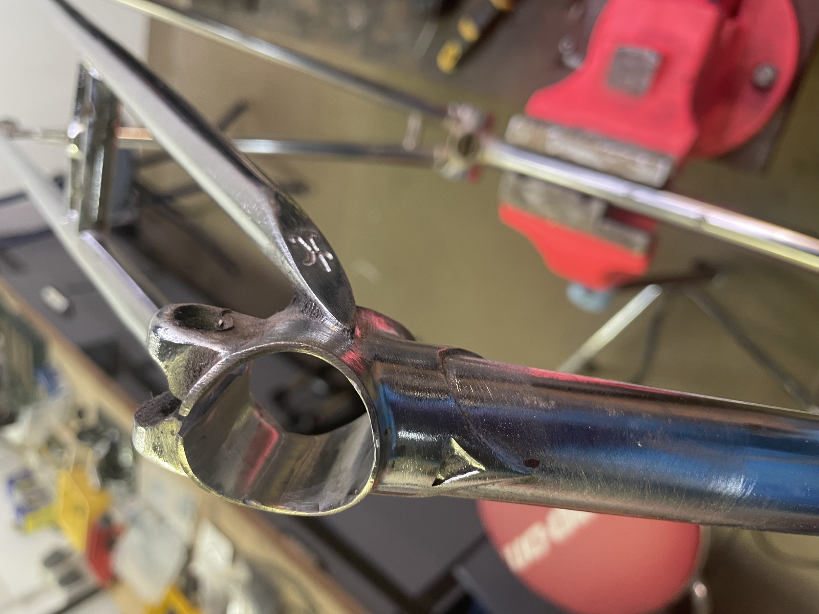 • die Stützenklemmung ist doch nun obsolet. Wäre es keine Option, die Muffe gegen eine neue zu ersetzen, dei noch ungesägt ist und keine Klemmohren hat? Am besten aus Edelstahl, das harmoniert in poliert mit den Steuerkopfmuffen.