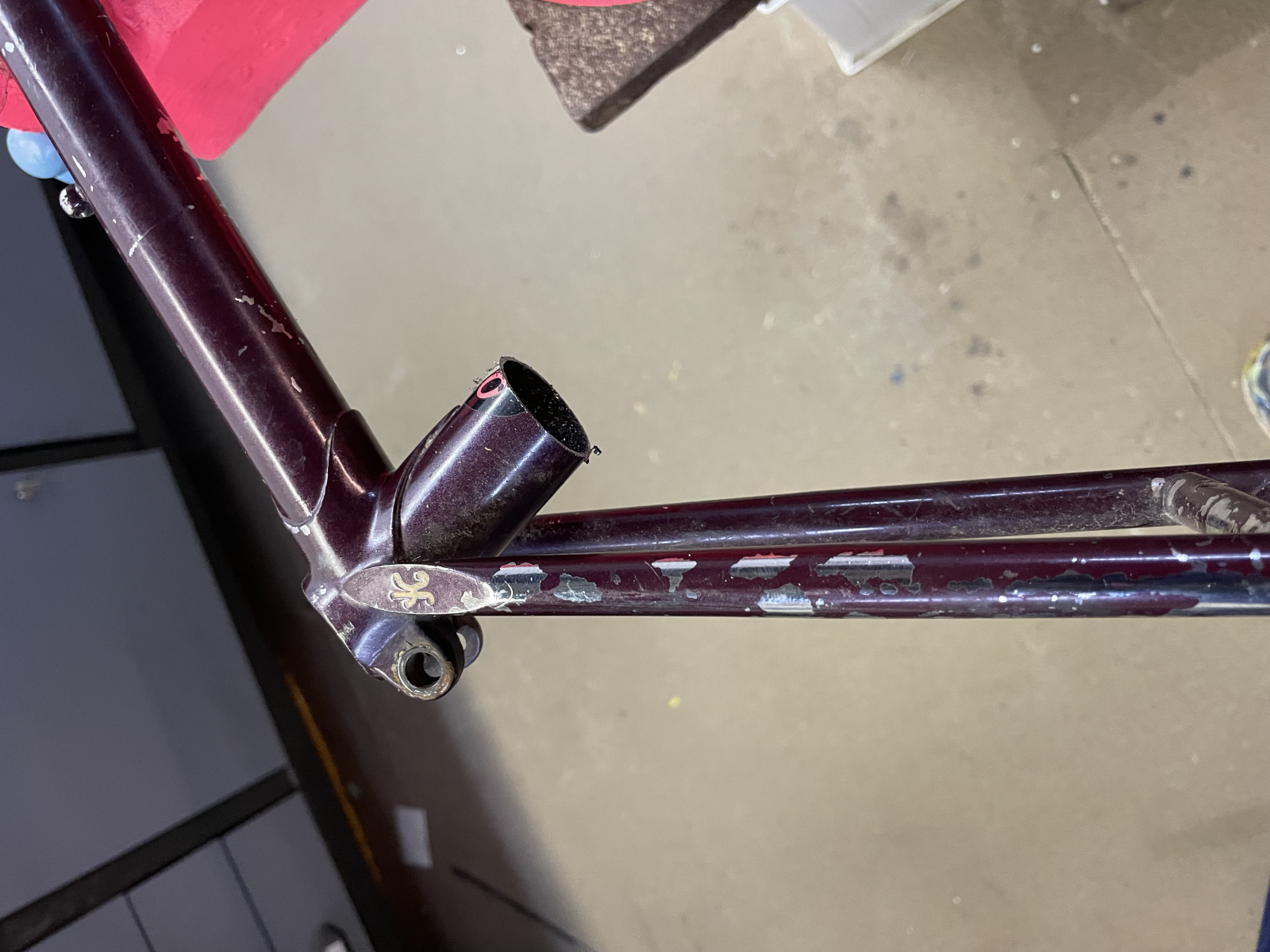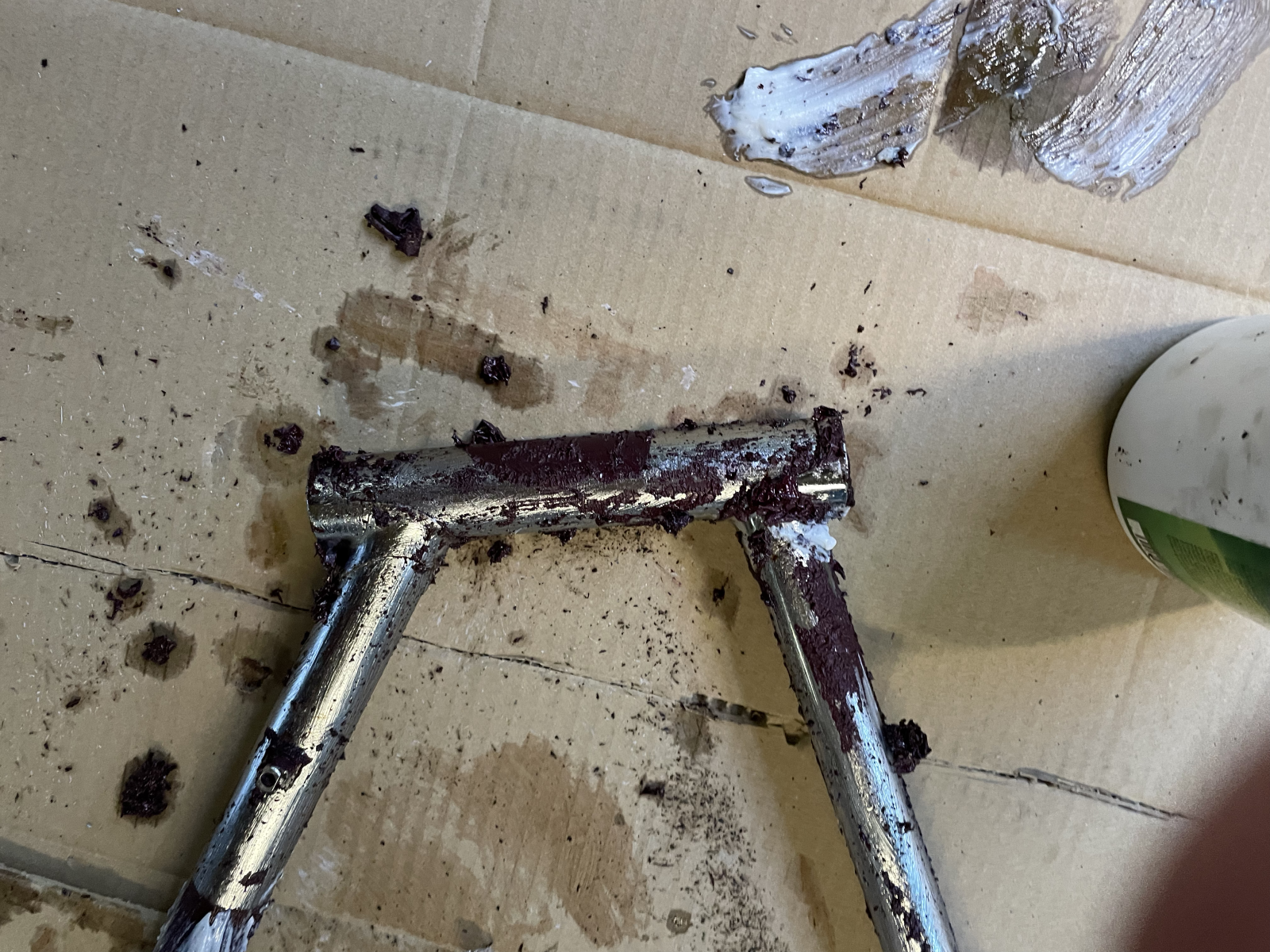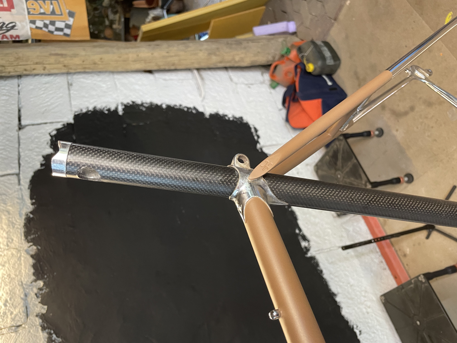 Theoretisch ist die Sattelklemmung nicht mehr nötig, aber habe ich bewusst gelassen und nutze sie zum Unterstützen der Klebung. Denn somit kann mir nicht passieren, wenn die Klebung nicht halten würde, weil ich das Rohr mechanisch festhalte, also im schlimmsten Fall der Rahmen plötzlich im Tretlager weich wäre, aber das Rohr nicht nach oben rutschen könnte. Das Loch unter dem Sattel ist von der Sattelklemmung, sieht man später im Bild noch.