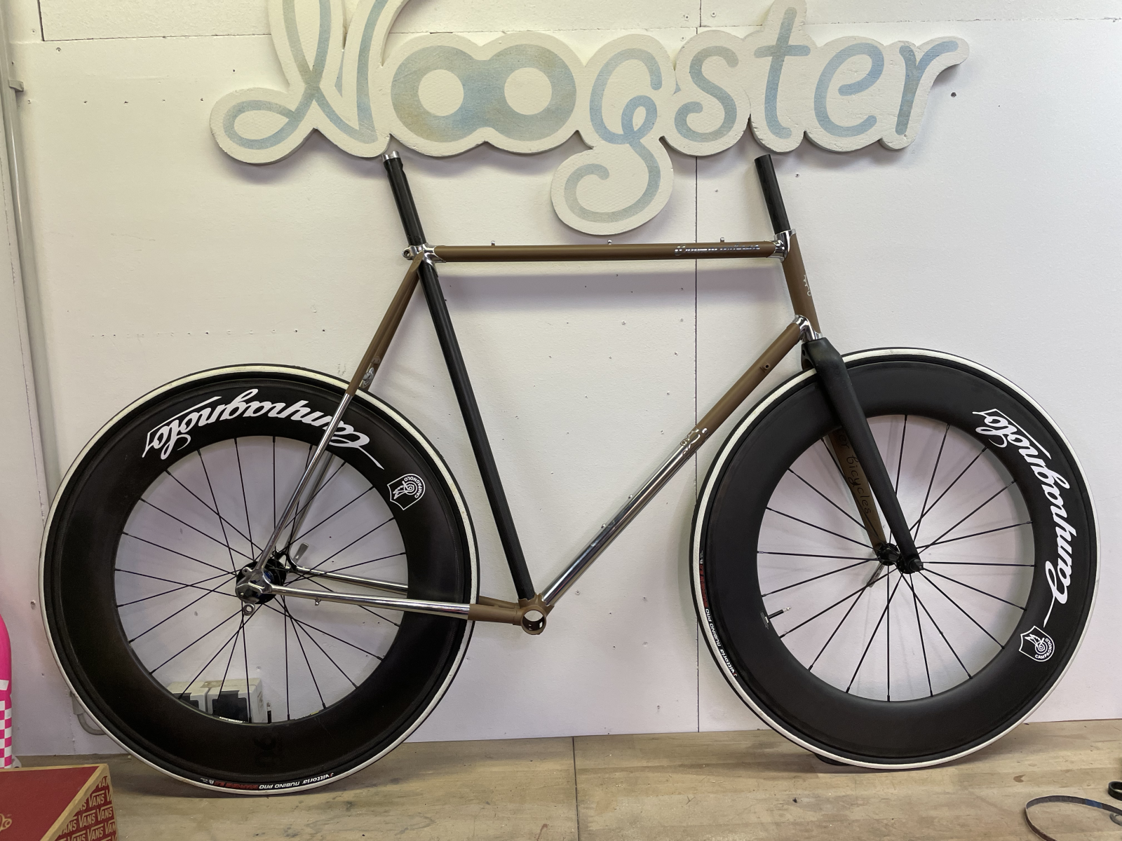 Der Aufbau sollte dann mit einer mechanischen Campagnolo Record/Super Record erfolgen. Der Schriftzug auf der Kurbel war mir zu langweilig und wurde erstmal geändert. Dazu kamen sehr leichte Bremsen und ein 90mm Carbon Laufradsatz, den ich mit Campagnolo Schriftzügen in weiss , passend zu dem weissen Streifen auf den Vittoria Mänteln aufgehübscht habe. Viele hassen diese Räder in einem klassischen Rahmen, aber mir gefällt es. Die Felgen habe ich vorher erstmal auf Campo-kompatible Naben umgespeichert und die silbernen gegen schwarze Speichen ausgetauscht. Eventuell kürze ich später noch die Gabel, aber da ich bei dem Vorbau die Gabel nicht durchstecken kann muss ich nach paar Touren abwägen, wie ich sitzen möchte. Mittlerweile habe ich ca. 110km schon gefahren und alles funktioniert und hält. Der Lenker wird irgendwann noch geändert oder poliert, denn der Specialized Schriftzug stört etwas.