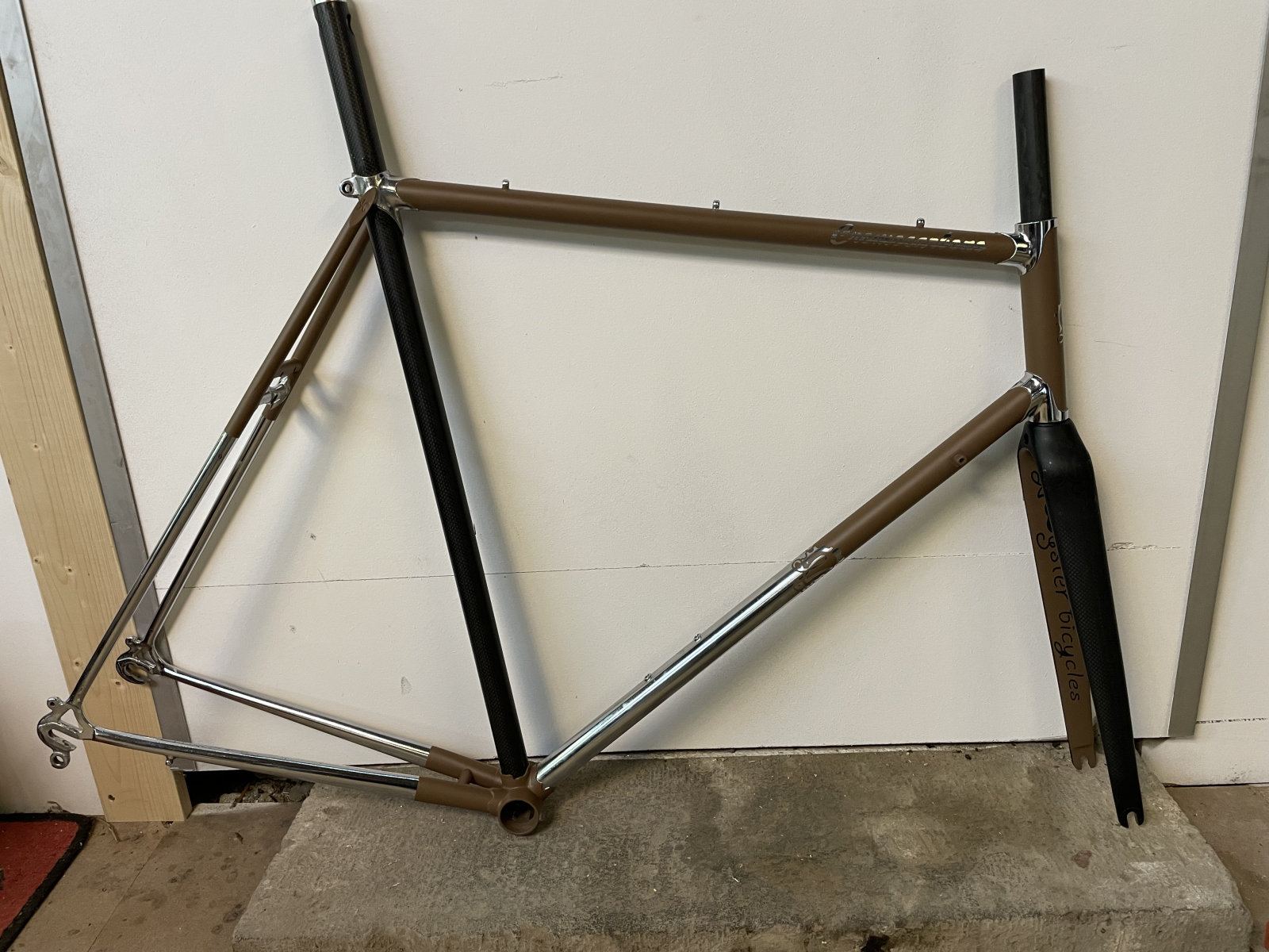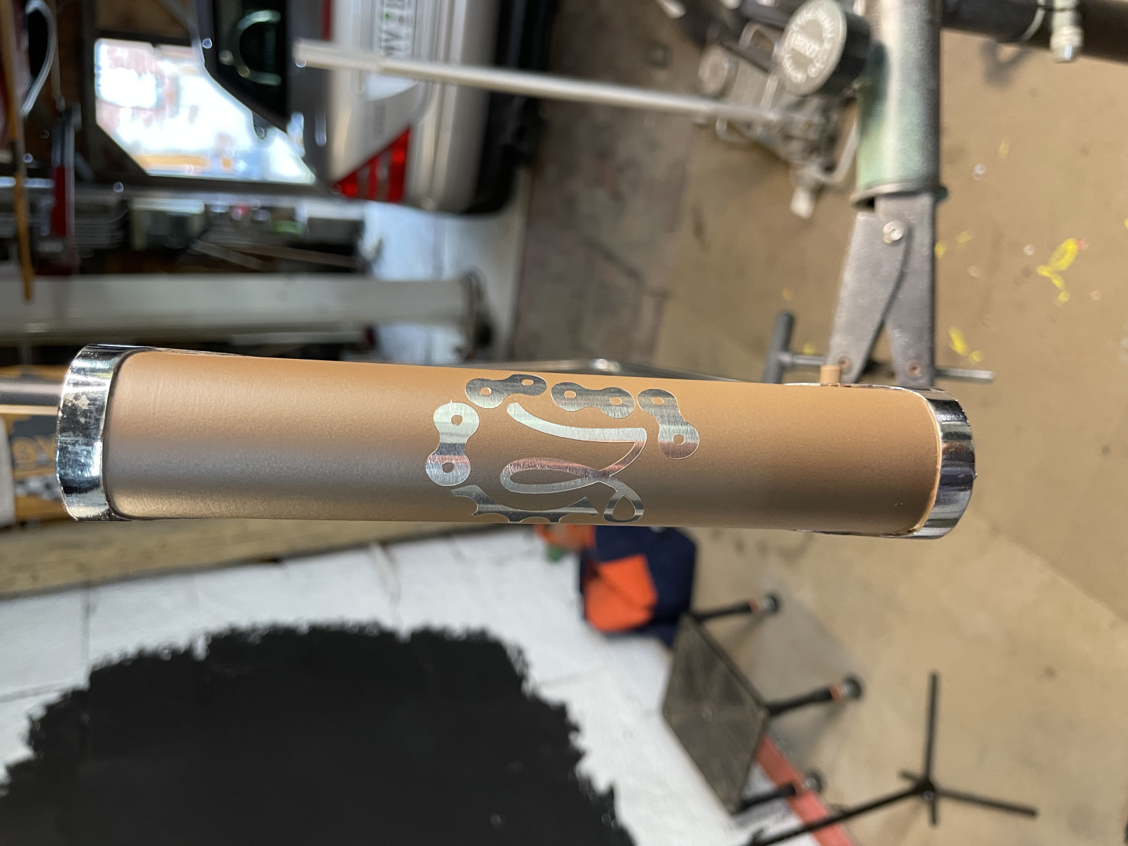 Paintjob! Ich habe mich dann für einen matten Farbton passend zum Sattel entschieden, also "Matschbraun" RAL8025 . Das Ganze dann kombiniert mit Chrom und passend zum Carbonrohr mit einer 1" Carbon Ahead Gabel. Diese dann in einer gerade Form zu finden, war schwieriger als erwartet. Da ich mittlerweile in dem Projekt kein wirkliches Kotter mehr sehe, habe ich mich entschieden mein eigenes Logo zu verwenden.